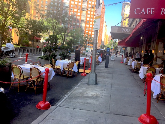 However, this summer right now it’s not a choice for restaurateurs. Either languish with sporadic take-out orders or offer outside cafe-style areas. Curbside spaces seem to be cleverly protected with fencing and plant stands. Not out in the middle of the street.