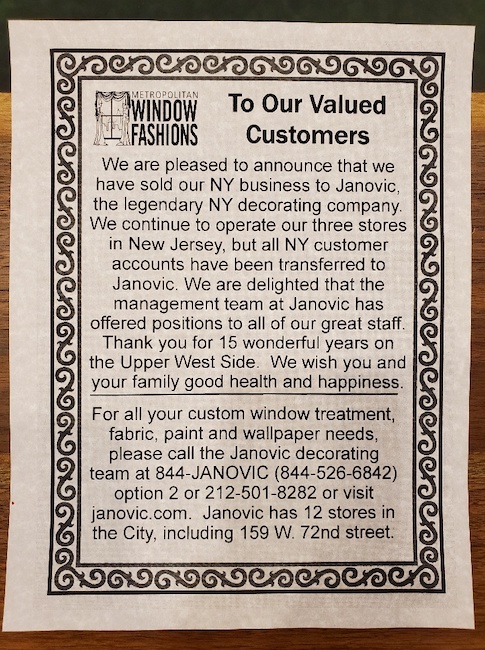 All customer accounts have been transferred to Janovic and they will be honoring all warrantees. Janovic has roots in NYC going back over 100 years. In addition to window treatments, they also offer fabric, wallpaper and paint. They have 12 locations in NYC. Our Amsterdam Avenue store will close, but they have two stores on the UWS including 159 West 72nd street and 2680 Broadway at 102nd Street.