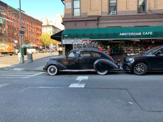 She says that air travel had just opened up and she was on her way to her hotel. If you land at LaGuardia, you go over the Triborough Bridge to 125th, down 125th to Amsterdam which is 2-way street to 110th. Not a bad way to go. The car in the picture is the advertising car of the Hi-Life bar/restaurant on Amsterdam and 83rd.