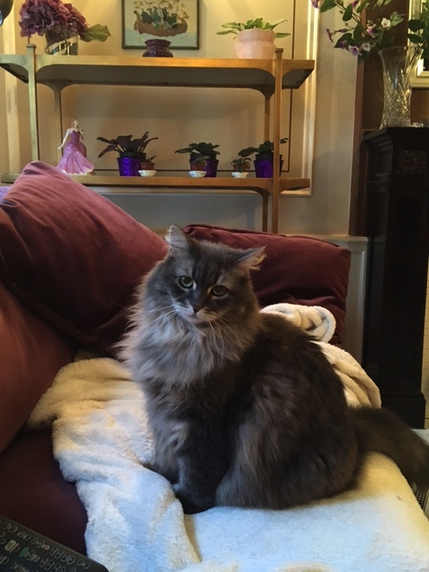Both rescues, Muffy is a spritely 8 year old, with long, thick, beautiful fur. She has some characteristics similar to a Siberian, which may explain why she loves to lie on cool tiles and sit in her condo by the air-con. Bialy, on the other hand, warms her back in the sun, and will leave the room if it’s anything under 78 degrees. At 6, she’s the younger kitty, but clearly the boss, pawing snacks away from under Muffy’s nose and sprawling on the coffee table where she can be the center of attention. She loves having her velvety gray tuxedo coat brushed, whereas Muffy prefers to groom herself, doing a very good job despite having multiple layers of fluff!