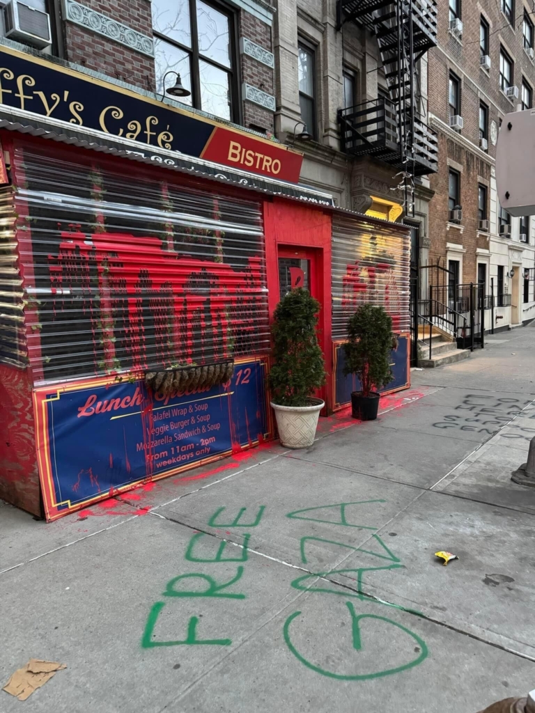I find this kind of behavior to be downright lazy. Non Jewish UWSider here who calls for a ceasefire in support of Gaza and is also a regular patron of Effy’s. To target an establishment simply because the owners are Israeli just makes you look stupid. I’m so sorry this happened to them and hope they can have it cleaned up and secure soon.