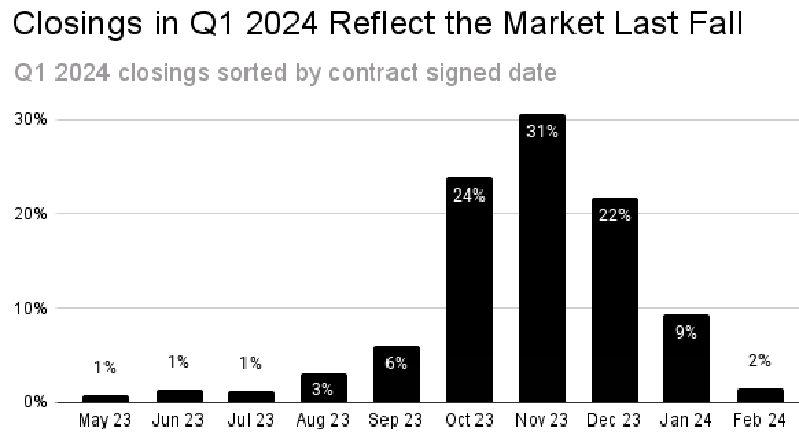 The chart below shows the most recent Q1 closing prices, which recorded the lowest price per square foot in three years. The following chart shows when those deals were actually struck, meaning when the contracts for those deals were indeed signed; the bulk occurred in November, when prices seemingly bottomed.