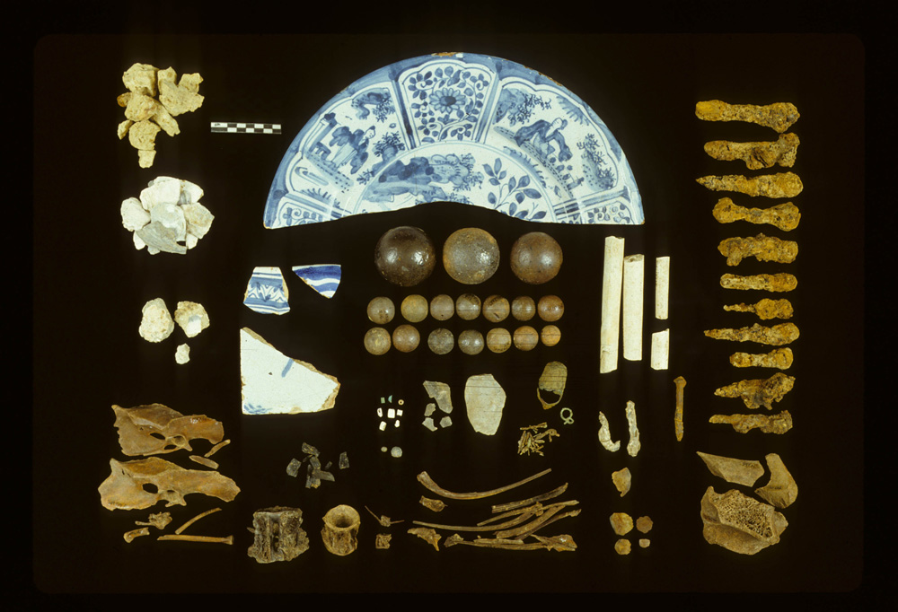 Most surviving artifacts from New Amsterdam relate to European settlement, but in 1984, a special group of objects – presumably collected by an enslaved African – was unearthed near present-day Pearl Street. This “mpungu” collection, found buried in a basket covered by a Dutch plate, includes shell fragments, shards of pottery, marbles, and a copper thimble. It was a Central African belief that the objects had to be broken and previously used so that a healer could engage with their energies.