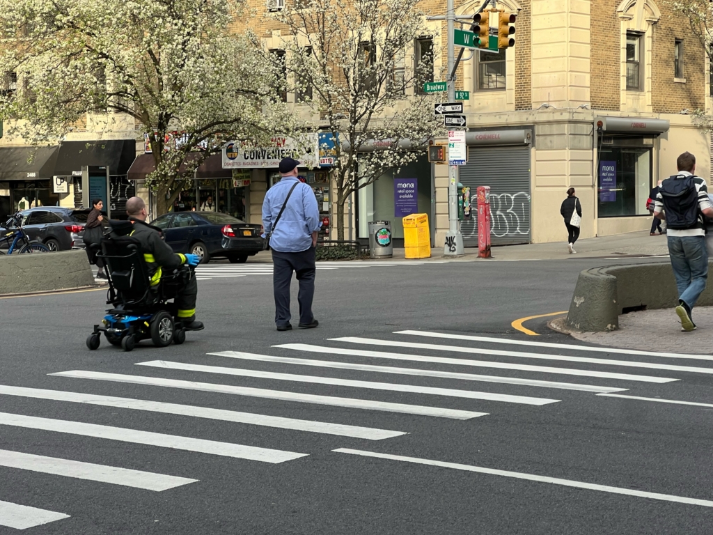 The pair traveled slowly up Broadway towards 93rd Street through heavy rush-hour pedestrian traffic. If any Upper West Siders found it strange that a fireman fully clad in bunker gear was driving a wheelchair up a Broadway sidewalk, none displayed any obvious signs of surprise. But the firefighter’s colleagues on Engine 74 could be seen snapping photos of the event as they circled around to pick them up at the other end of their journey.