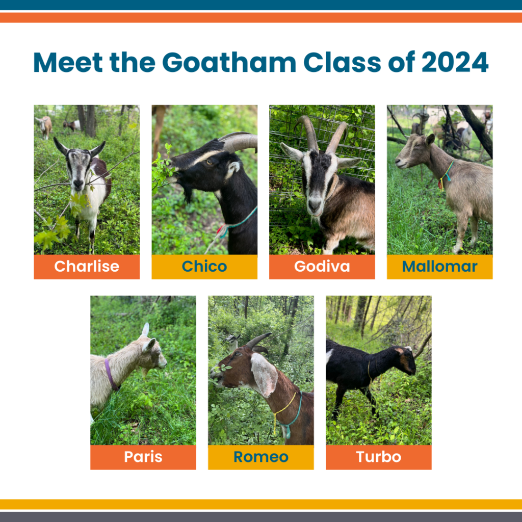 The goats are named: Charlise, Chico, Godiva, Mallomar, Paris, Romeo, and Turbo. Chico and Mallomar were both part of the 2023 class in Morningside Heights, and Mallomar took home the G.O.A.T. award, voted on by the public.