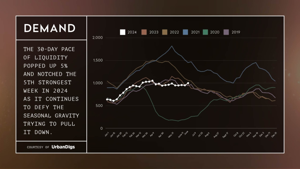 This was also helped by a slight increase in the number of sellers acquiescing to more moderate offers. Looking forward, the Fed also now looks keen to realize its first rate cut in September. So, if you’re a real buyer get ahead of an impending wave which will likely land fully by Spring 2025. It feels like being under cover at an outdoor event as it rains; some people don’t care and they’re out there standing in the rain (metaphorically, those are our current buyers), some start to slowly come out as the rain eases, and then finally, as the skies clear, everyone comes out. For the market, the worst of the storm has passed, but it’s still raining and slowly people are coming out, tired of being restricted and they just want to get on with it. Those waiting for “perfect” conditions will sadly miss the whole event.