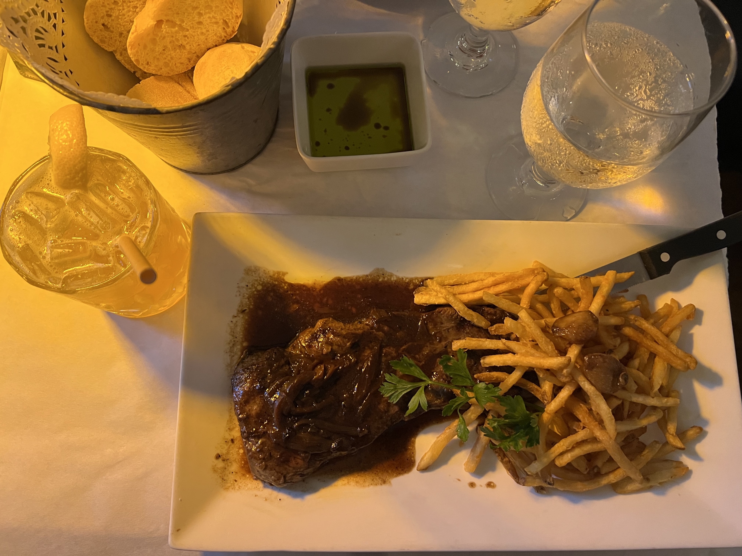 For my main dish, I decided to go with a premium skirt steak that came with red wine shallots sauce served with garlic fries. Now, let me tell you, when they say premium, the restaurant is not exaggerating. The steak cut like butter and was the perfect melt-in-your-mouth flavor.