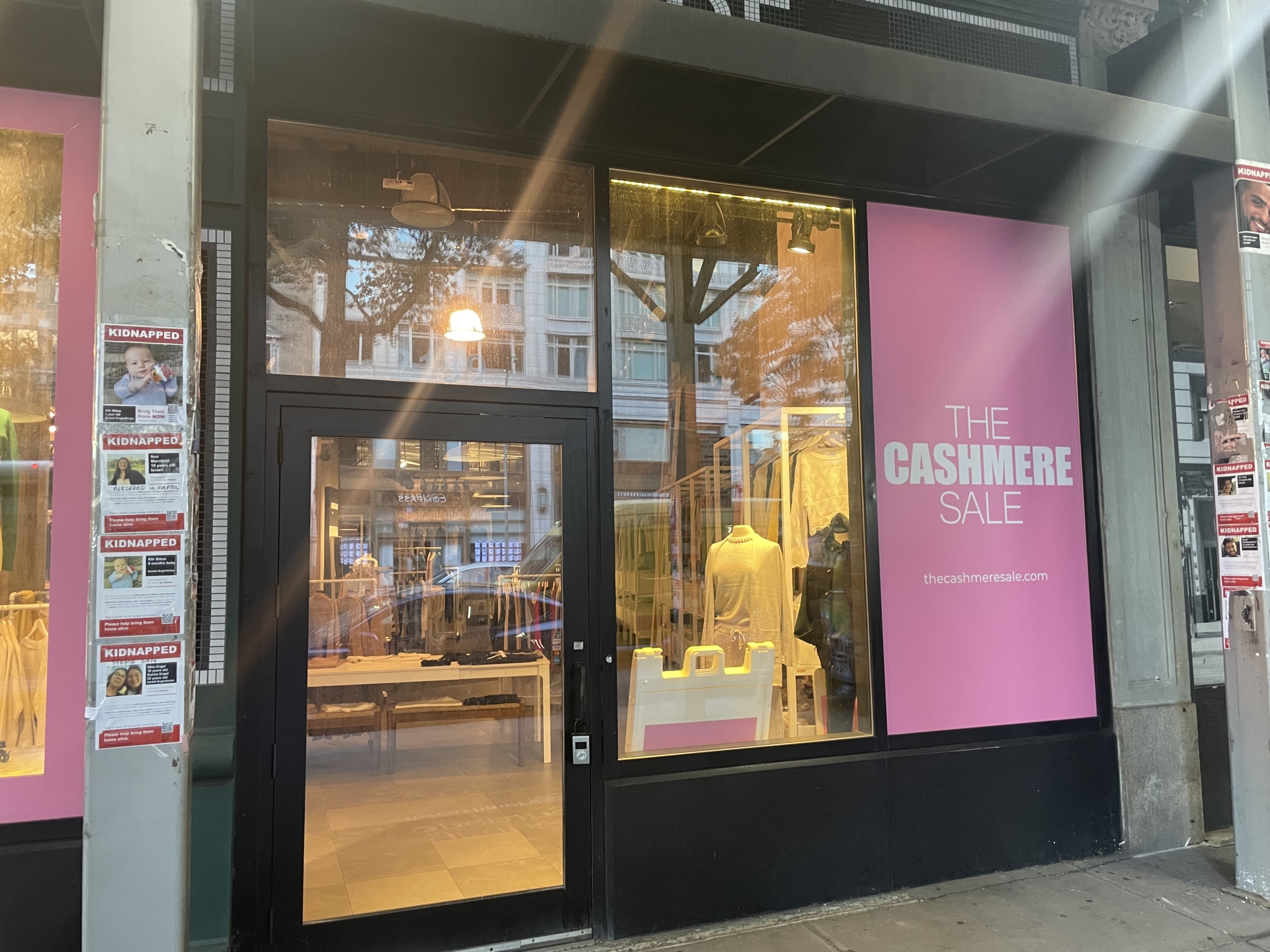 The Cashmere Sale, the annual pop-up store, is returning to the Upper West Side on October 9 at 2139 Broadway (corner of West 75th Street), a representative confirmed. The sale includes cashmere sweaters, jackets, vests, and accessories like hats, gloves, and scarves. The sale is planning to run through December 18. The space used to be a Lululemon, which closed in 2022. Hours posted on the website are Monday to Saturday from 11 a.m. to 6 p.m., and Sunday from 12 p.m. to 5 p.m. The Cashmere Sale has several pop-ups along the east and west coasts. Other locations in NYC include: on the Upper East Side at 1172 Third Avenue (opening next week), and one in Chelsea at 7 West 19th Street. (Thanks to Sanford for the tip.)
