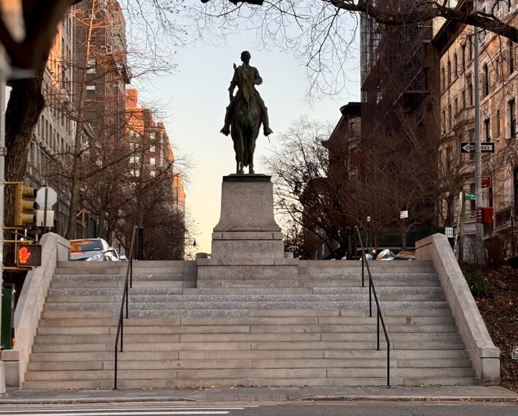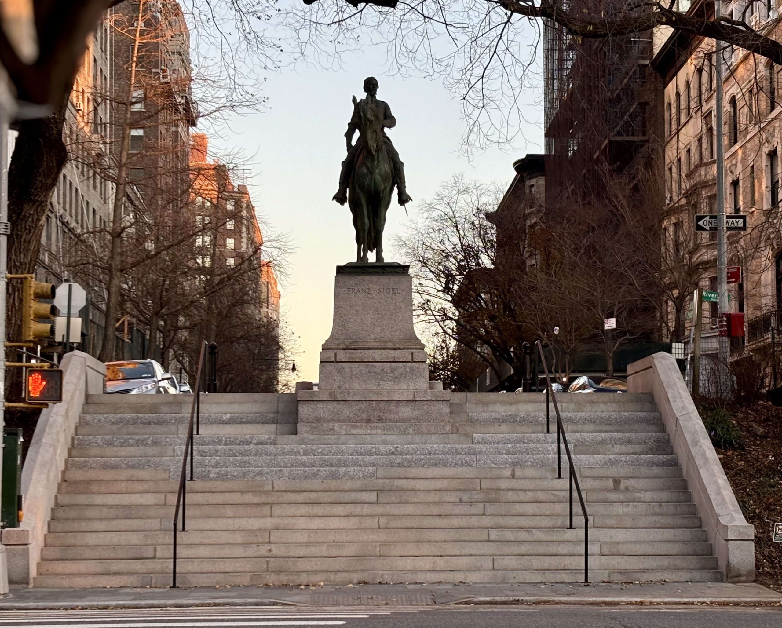 The recognizable bronze equestrian sculpture of German-American General Franz Sigel sits atop the staircase. That sculpture, by Austrian-born artist Karl Bitter, was installed several years after the staircase was built around 1900, so has its own foundation and came out of the SUV wreck unscathed.