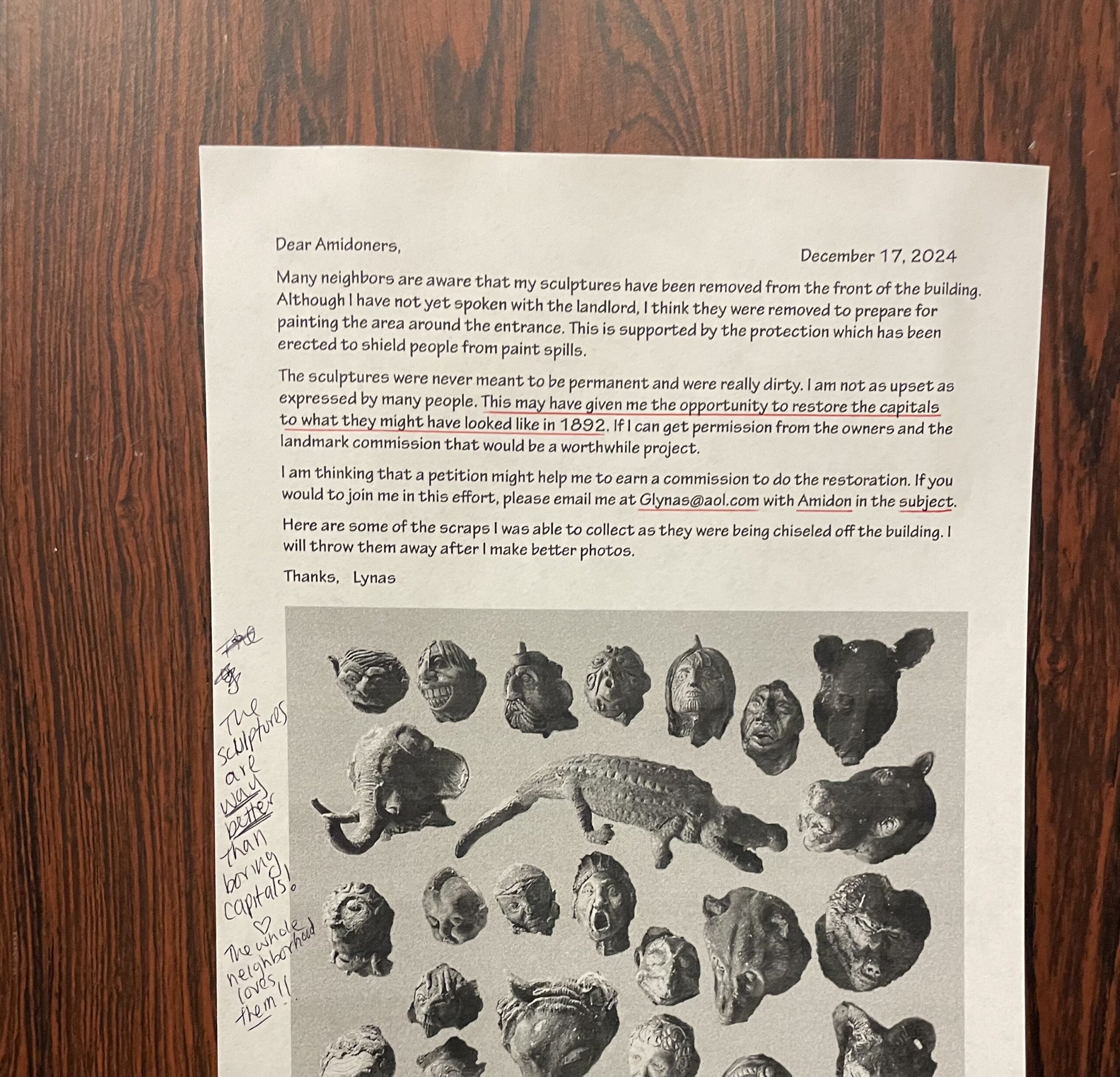 Some building residents protested the loss. “The sculptures are way better than boring capitals” on the facade columns, one wrote on Lynas’s elevator note. “The whole neighborhood loves them.”