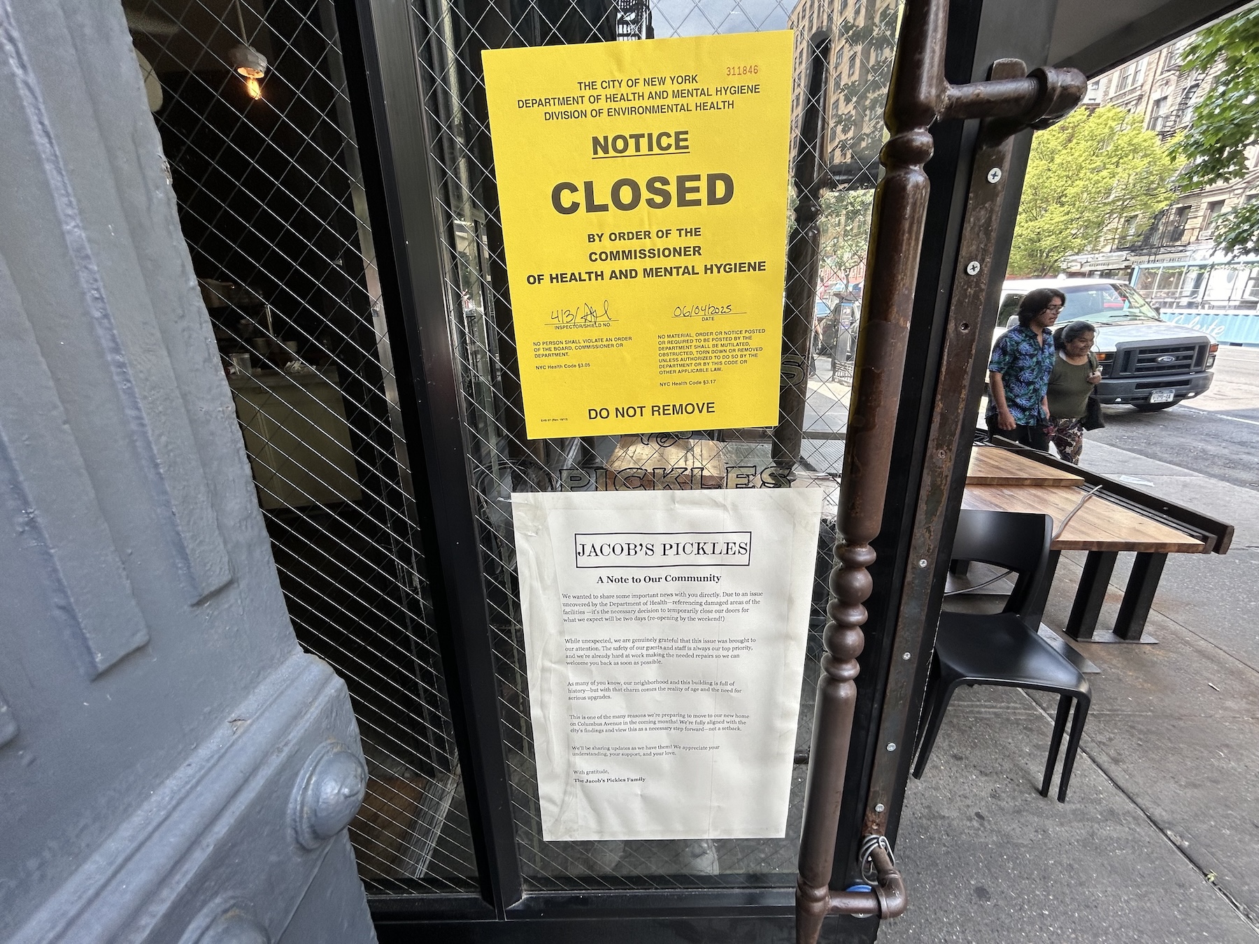 UPDATE II: 1 p.m. on Wednesday, June 11: Jacob’s Pickles reopened to the public on Tuesday following a successful Health Department inspection Monday, according to the city agency.