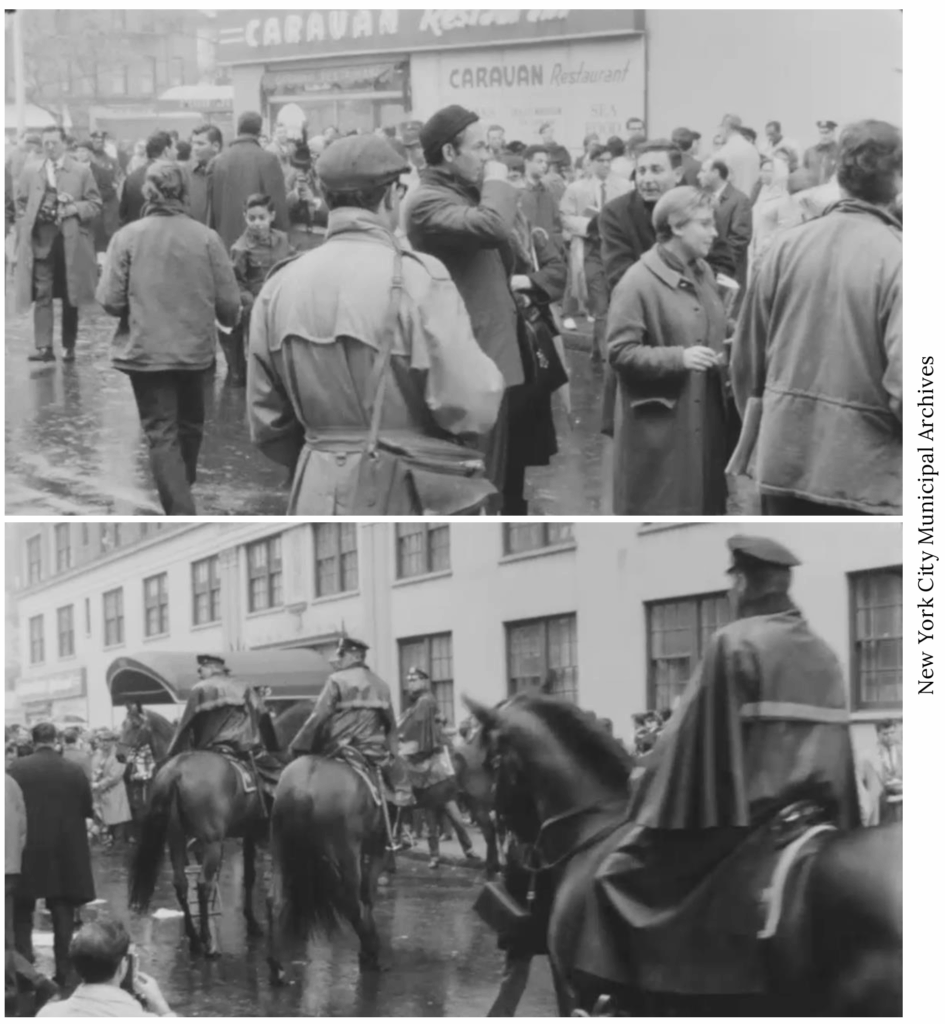 In 1967, I was frequently on W. 72nd Street between Amsterdam and Columbus. Where Greys Papaya is now, was some kind of hot dog place even then. It was not called Caravan. It looks like people are standing on the corner looking down the block. They are standing in the street not on the sidewalk. The street is closed to traffic. There are also no parked cars visible. The mounted policemen prevent people from moving down the block. I suspect that something is being filmed on this block.