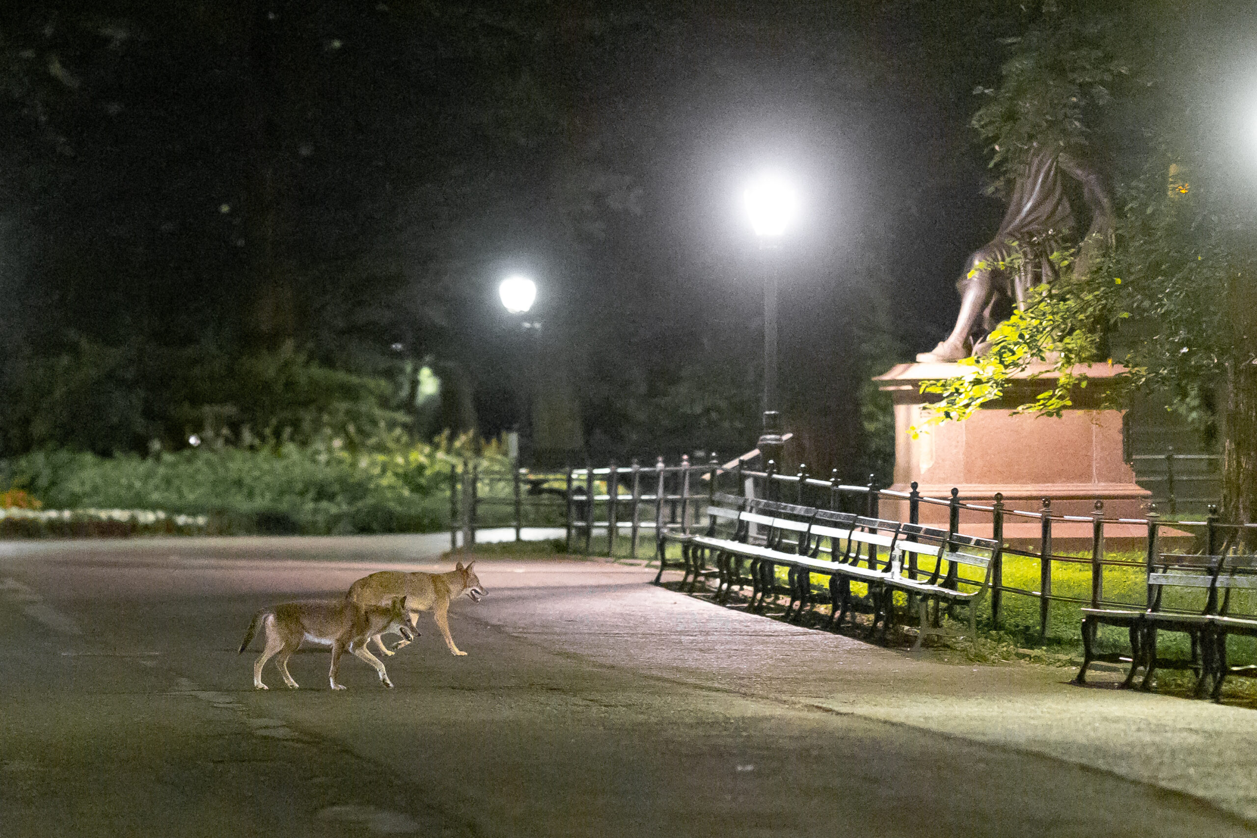 In June, Smithsonian magazine ran a photo-filled article by Lei and Emery about their six years of tracking the elusive canines, affectionately dubbed Romeo and Juliet. Under the cover of night, the handsome lovers emerge to stake and explore their territory. They lounge in the Delacorte Theater and stroll along East Drive. With their thick coats, bushy tails, and muscular bodies, they bear little resemblance to Wile E. Coyote, their scrawny, hapless cartoon cousin.