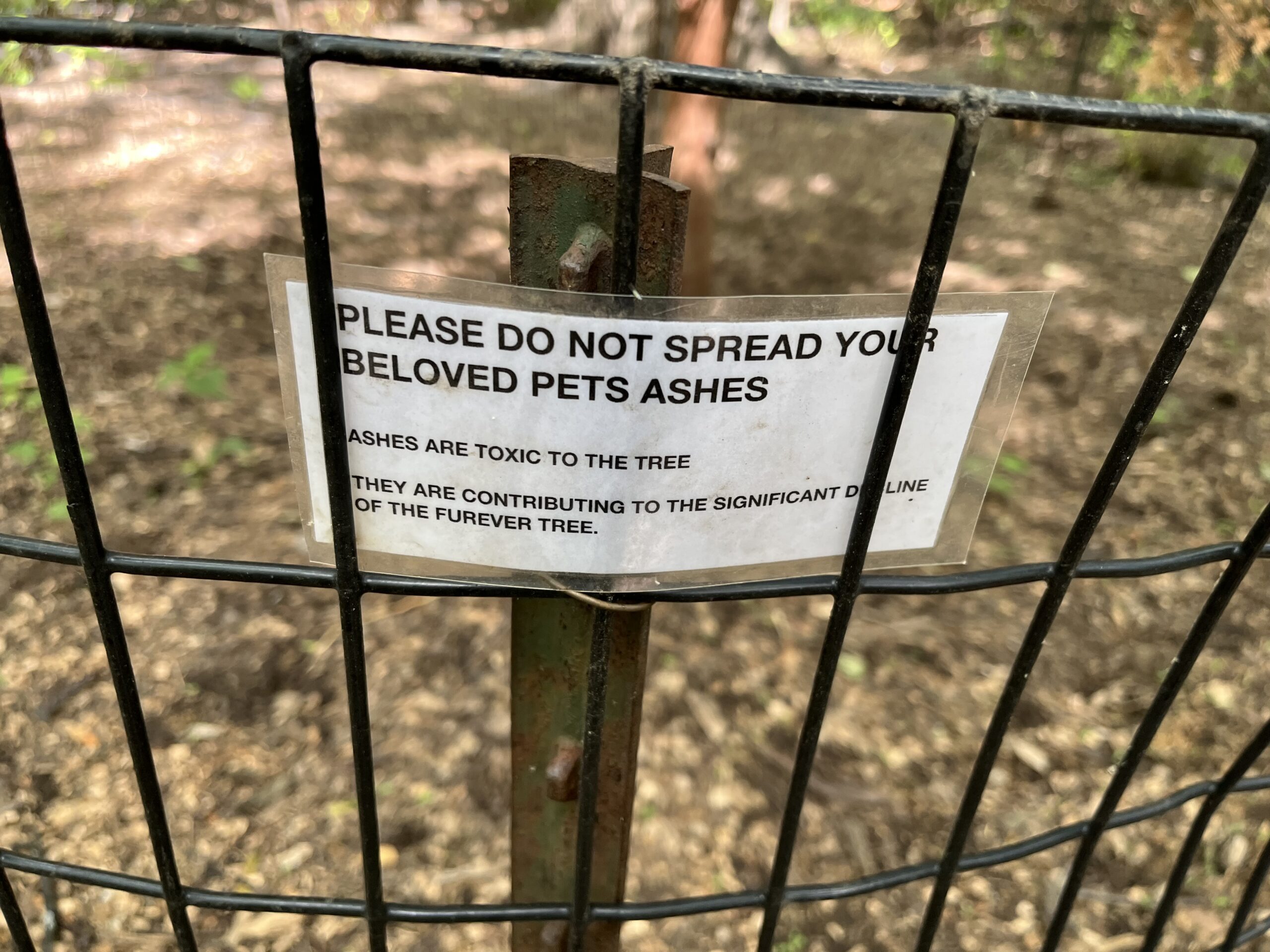In the past couple of years, a sign of unknown origin had also been placed on a fence in front of the Central Park Pet Memorial Tree, asking visitors to please not spread the ashes of their “beloved pets.” “Ashes are toxic to the tree,” the sign warned. “They are contributing to the significant decline of the Furever Tree.”