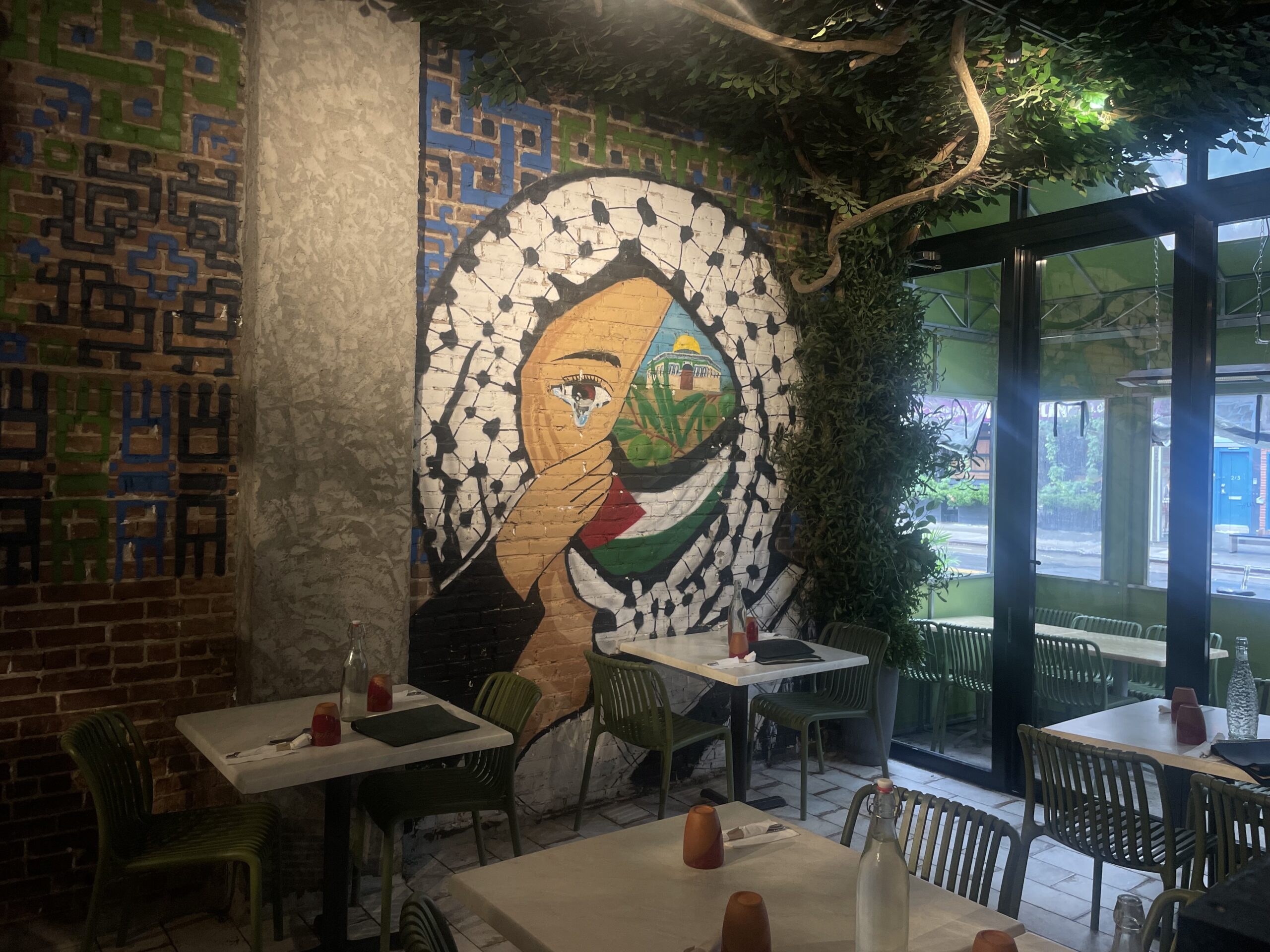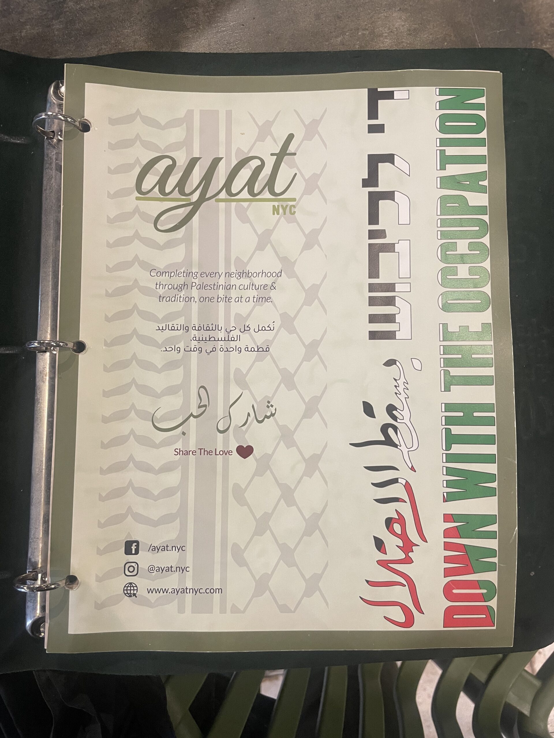 Open the menu at Ayat, a Bay Ridge-based Palestinian restaurant slated to expand to the Upper West Side this fall, and you will be met with one phrase written in Arabic, Hebrew, and English: “DOWN WITH THE OCCUPATION.” Inside the restaurant, olive trees, Palestinian flags, and keffiyeh patterns are the main motifs. Even the takeout bags bear an inscription: “Jewish, Muslim, Christian—whatever your belief is, we are all human, and we love you.”