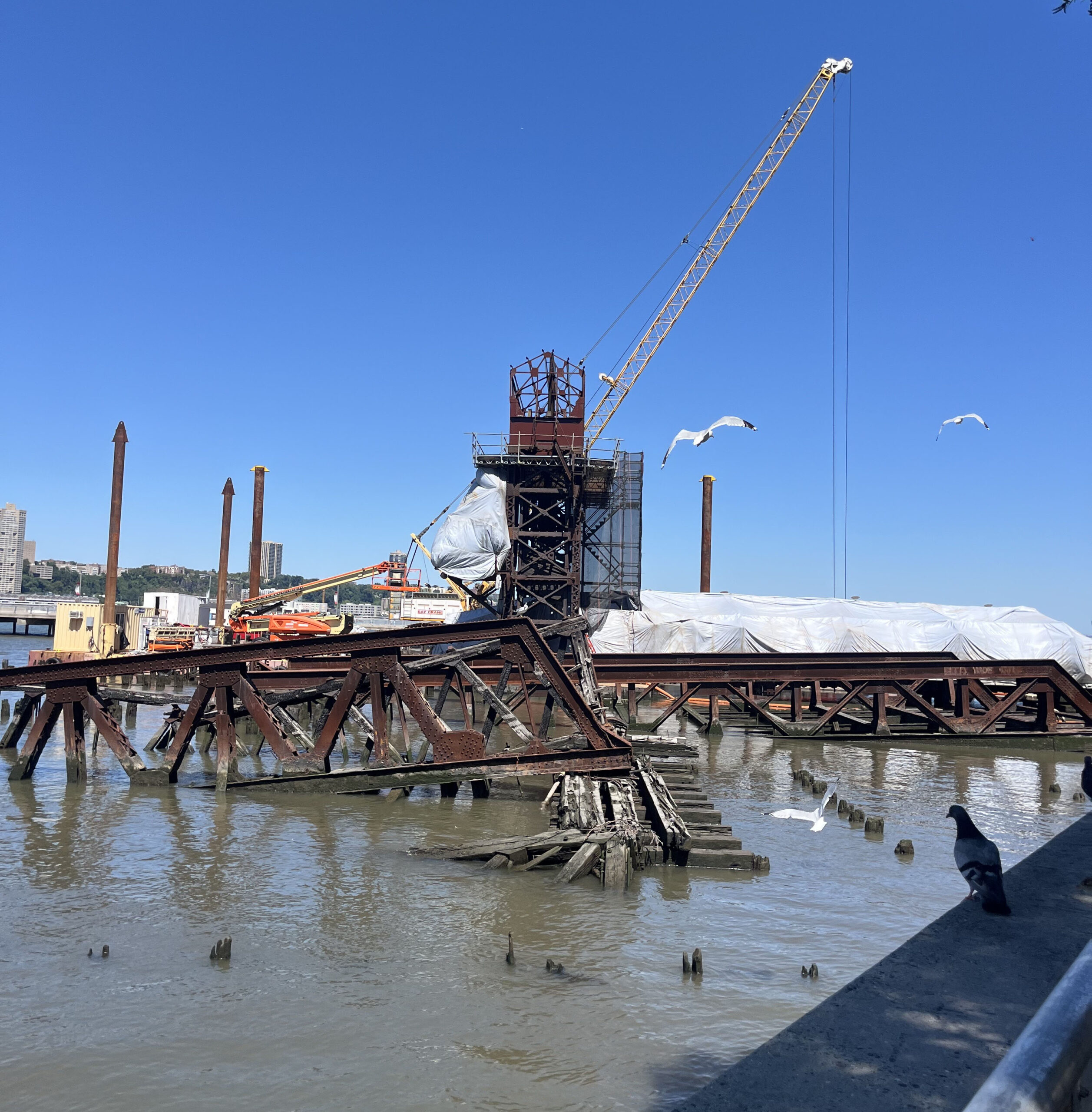 Readers have been asking about activity at the old 69th Street Transfer Bridge in Riverside Park South. The historic structure, once used to move freight cars from a nearby rail yard to barges for transport across the Hudson, is being stabilized and restored, with new lighting also to be added. Signage appeared at the end of January and permitting efforts were underway in the spring, with work beginning in earnest in June with the arrival of barges and heavy equipment. The project is mostly being staged from the water, though supplies have also been brought in by truck and transferred to the site from Pier i using a crane. For more on the project, see our article from October 2024. — Dan Katzive