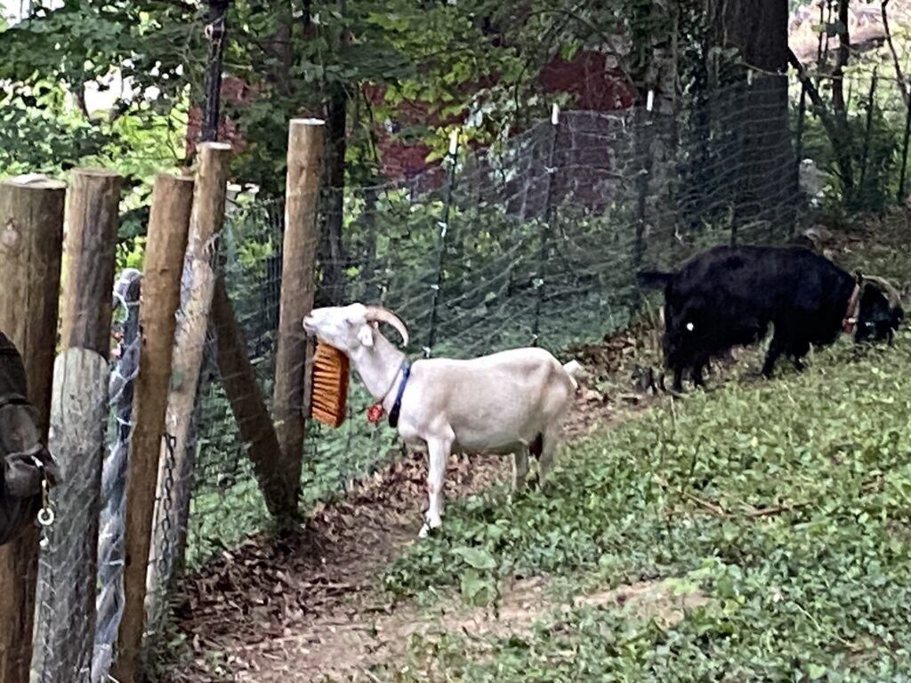The goats spend their nights in a catering-type canopy with three windowed canvas walls. A special feature of the enclosure is a huge, industrial-strength broom head, fastened to a post. The goats love it for back-scratching and head-scratching. A highlight of the morning is greeting them as they awaken in this tent. We spray and brush them down to hinder insect infestation and look for any injuries. Then the tent is cleaned, meaning poop is shoveled, soiled bedding replaced, hay feeder bags and water buckets refilled.