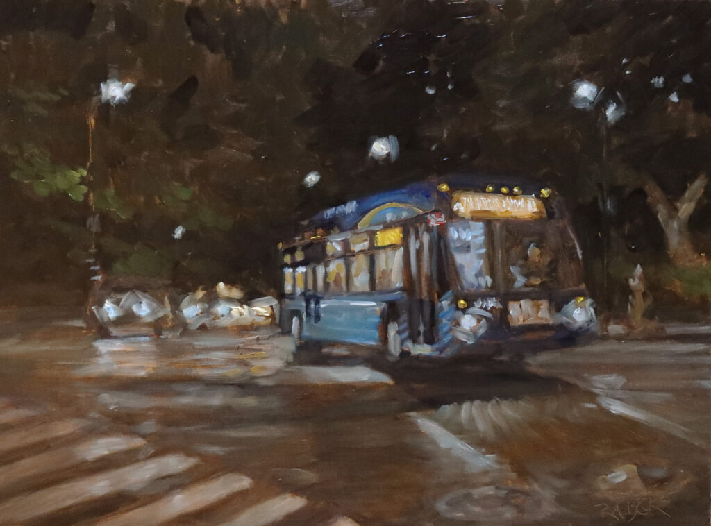 New York has a number of options for getting from one place to another, especially if money isn’t an issue. That’s the way a lot of things are going lately. Fortunately, I can walk to and from my studio and most of my subjects, but when I’m carrying a load or it’s too far to drag an easel, I go for a cab. If the weather gets bad, the subway is a block from home and a block from the studio. That back-and-forth is the bulk of my travel. I don’t take a bus that often.