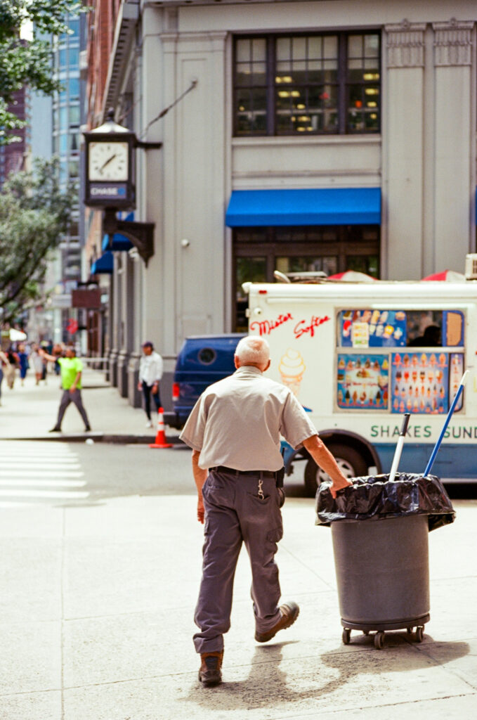 The fella pushing the wheeled garbage can near Mr. Softee works in my building. The Mr. Softee truck oftentimes parks on 73rd and Verdi Square, and is my go-to when there is a need (want, desire) for a root beer float.