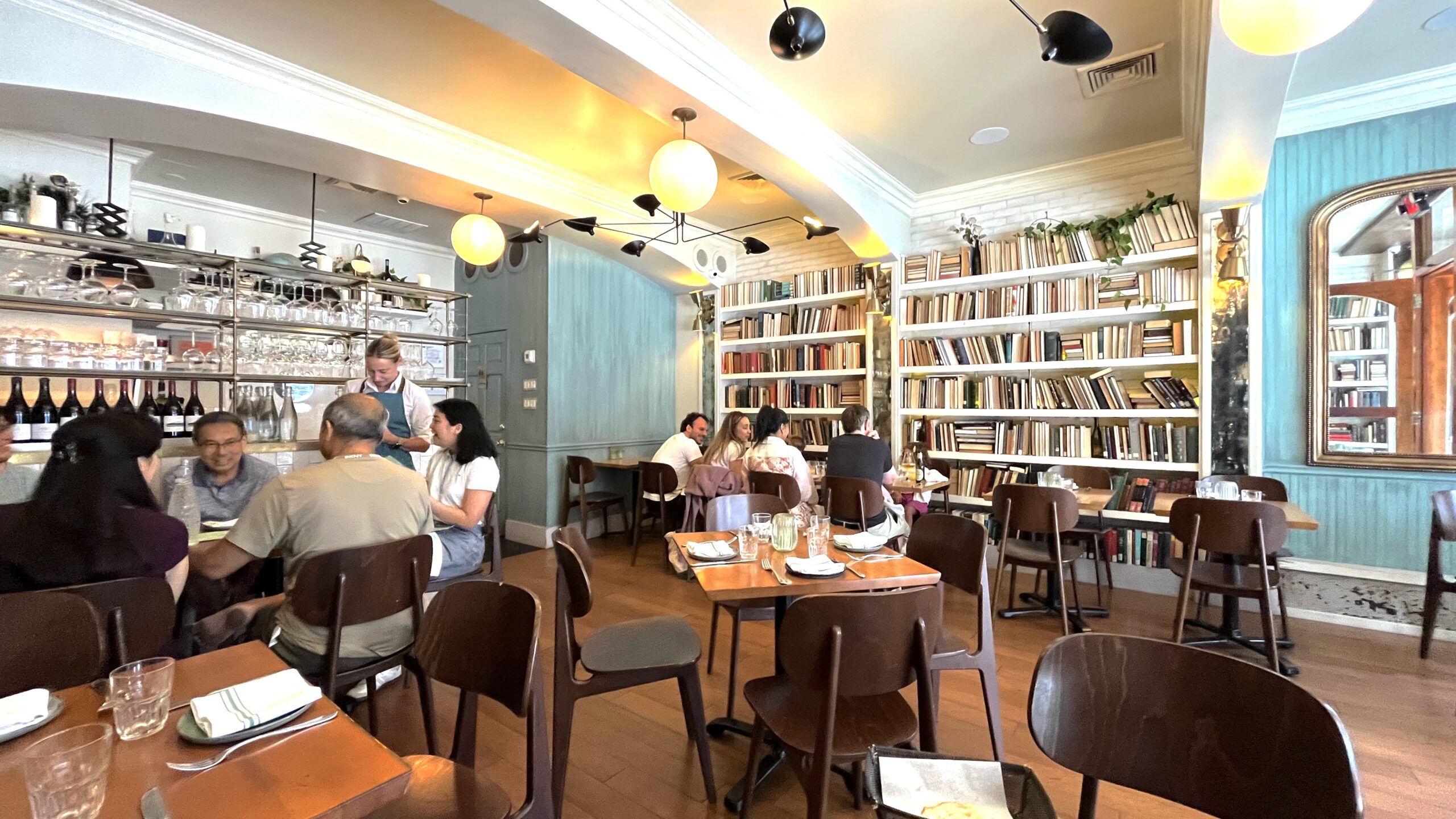 Just like its menu, Accademia’s “biblioteca”-type decor is small, inviting, and stylish without being pretentious. The 3,500 vintage books lining the shelves offer a soothing, sound-controlled, intimate space ideal for conversations. “Accademia” has historically been used to name places where Italian academics gather for wine and antipasti “and talk about their affairs or their plans all day long,” Akinci said. “We wanted to find a theme that would appeal to the fabric of our neighborhood.”