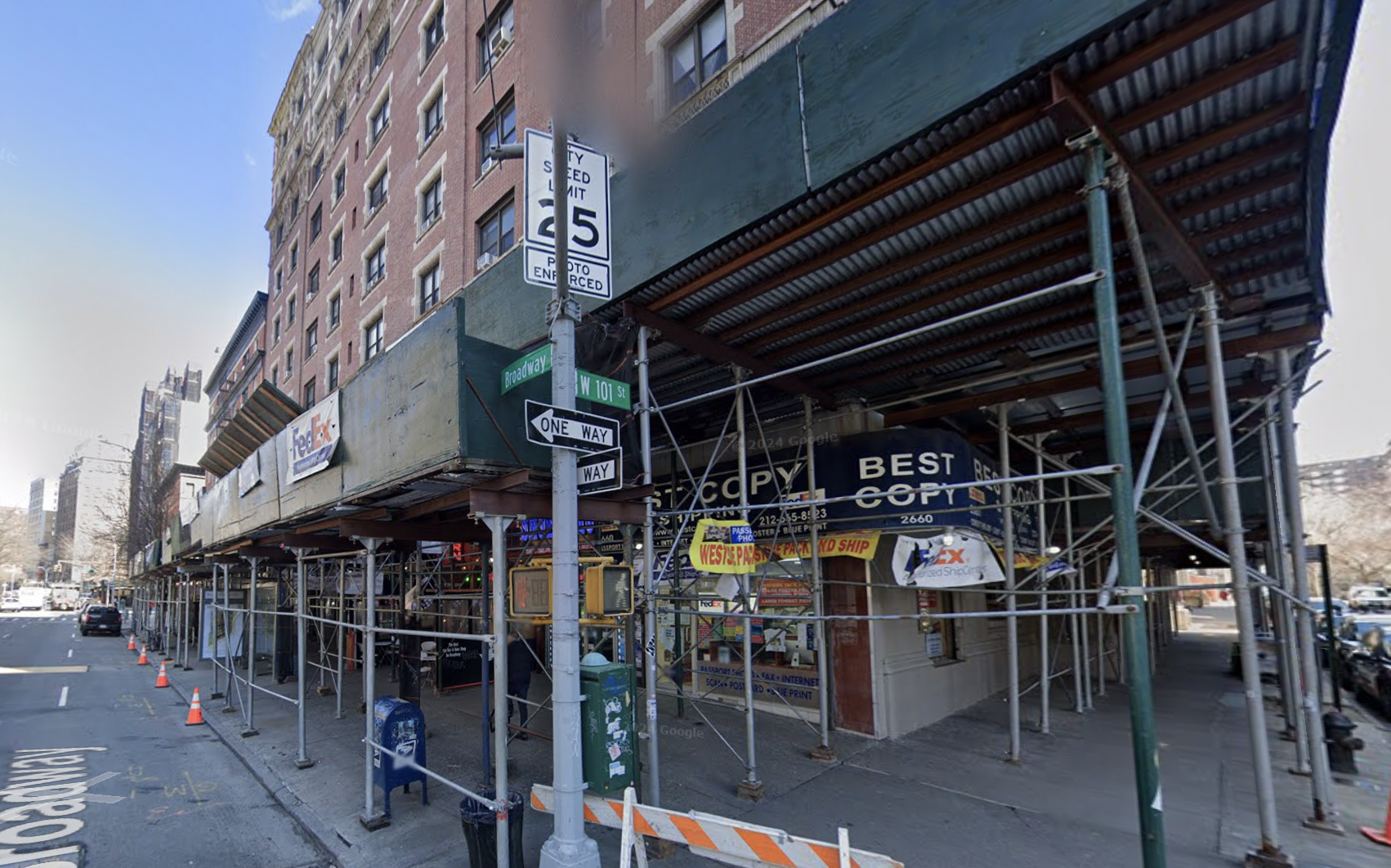 Google Maps imagery shows there was a sidewalk shed on the corner of West 101st Street and Broadway from around 2021 to 2023, before it came down sometime last year.