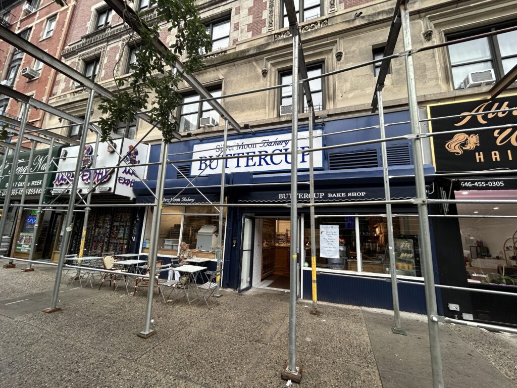 The new sidewalk shed covers multiple buildings near the corner of West 101st Street and Broadway, including the new Silver Moon Bakery BUTTERCUP shop.