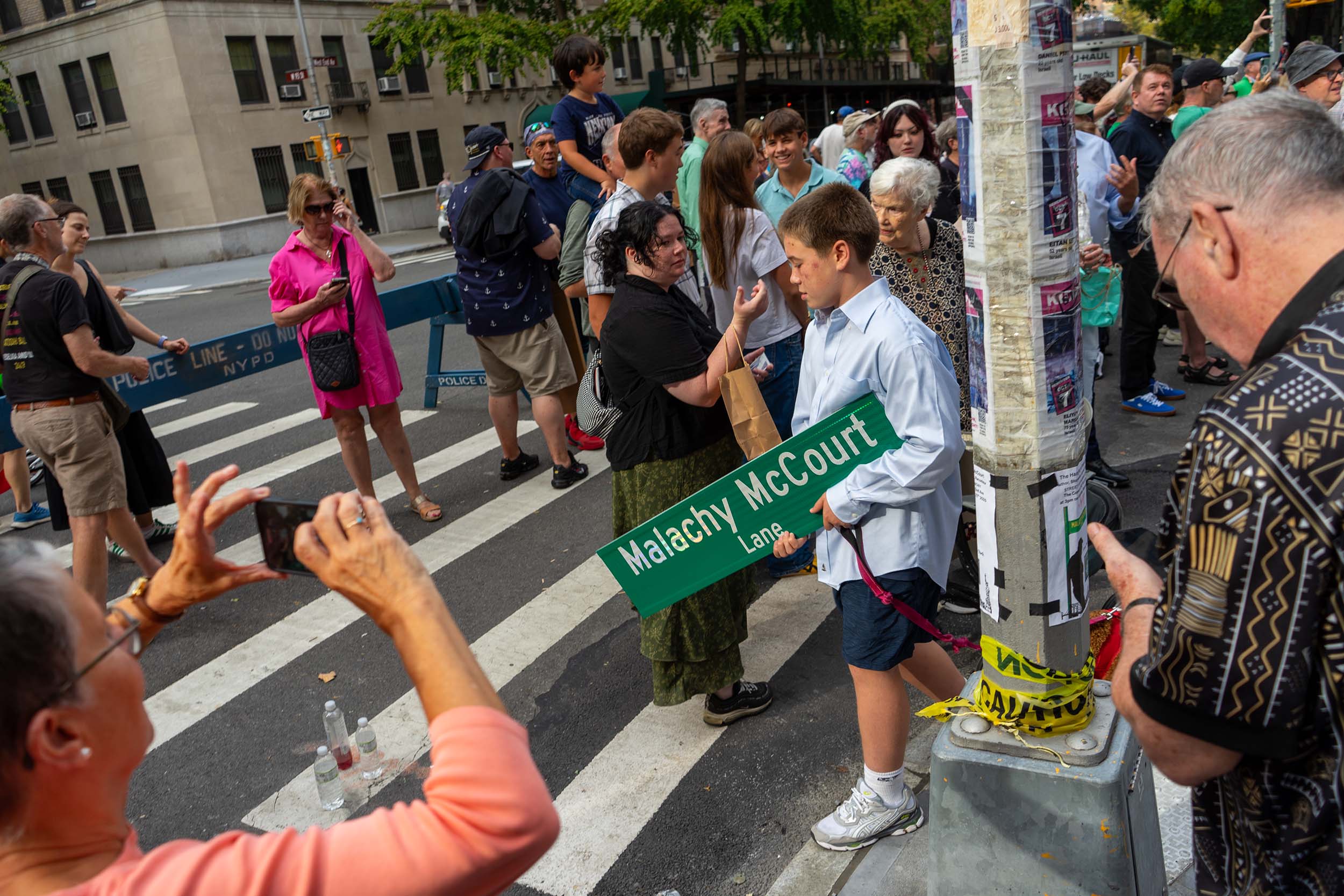 After the speeches, the McCourt family gathered underneath the street sign on the corner of the block. The crowd counted down, and the new metal street sign was revealed. The event ended with the crowd singing “Wild Mountain Thyme,” a traditional Irish folk song that had become a signature song McCourt would close performances with.