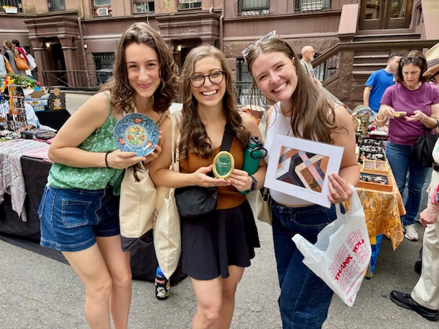 A group of three UWS friends who were making their way up and down West 104th Street showed off the bargains they’d landed. One of them, Morgan, had purchased an original matted artwork for $20. “I didn’t haggle,” she said, “because I liked the artist’s story. He’s lived on the UWS all his life, and on his lunch break as a substitute teacher, he made art.” Morgan’s friend Francesca had found a small oval-shaped brass frame, in which she planned to mount a picture of her cat, Maximus. Their third Musketeer, Karis, held a small ceramic mug and plate. “My aunt used to have pottery like this when I lived with her in Oklahoma during college,” she explained. “It feels like a family moment.”