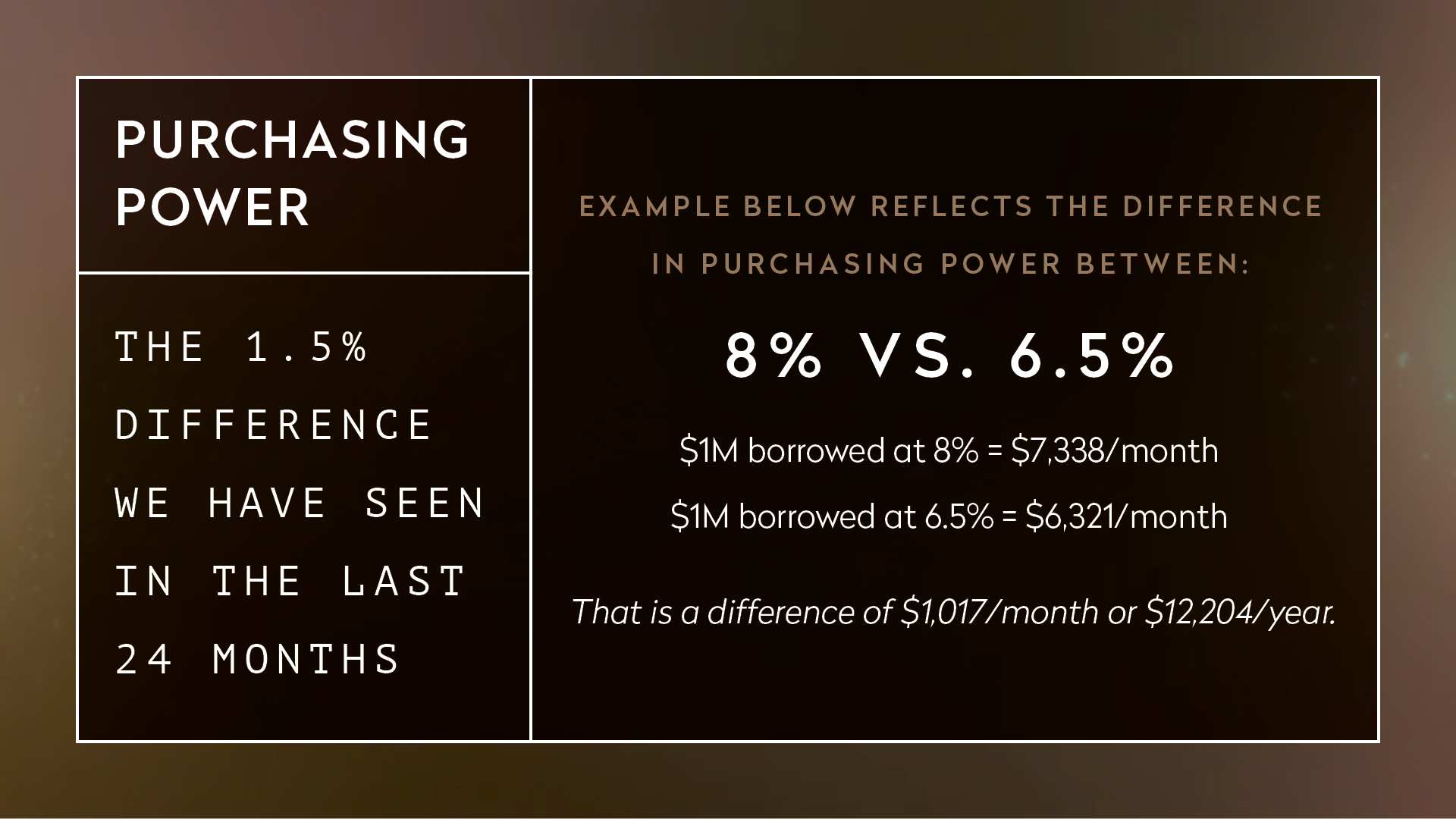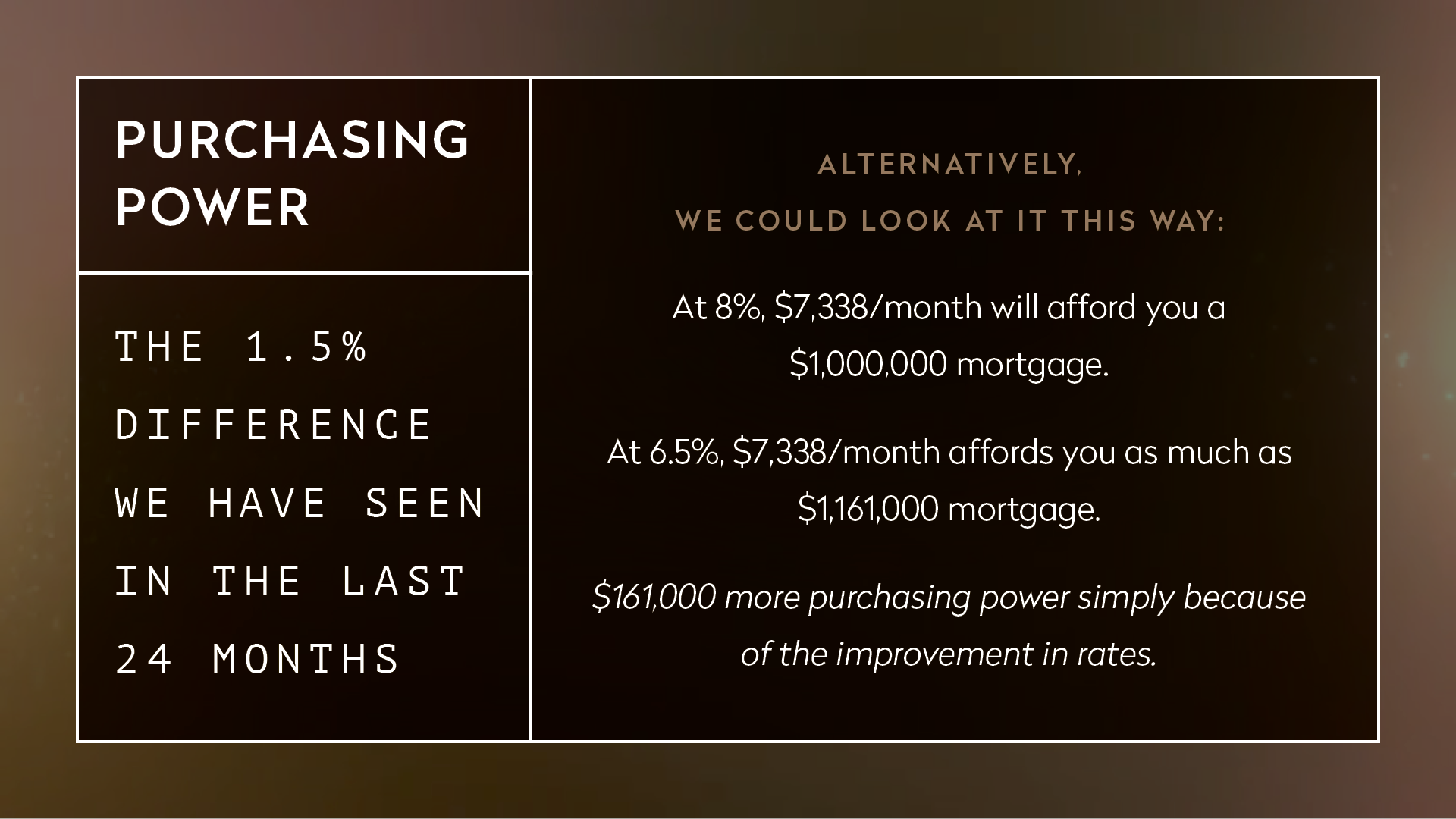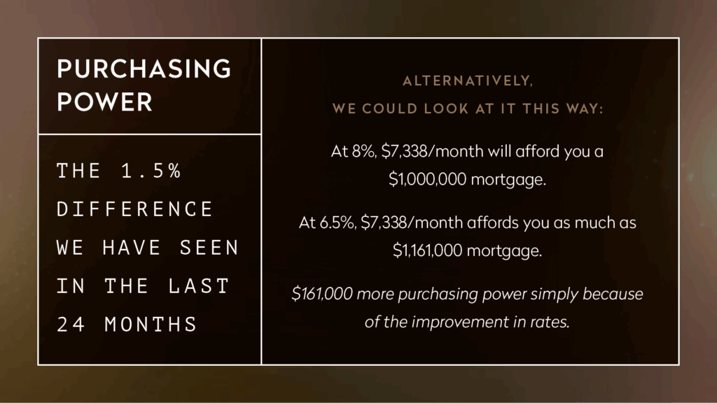 But, these are the broad strokes. The market is far more nuanced and segmented than that. For example, as mentioned, overall supply is up 2%; however, if we break it down between inventory above and below $4M, you will see that it is up 6% below and down nearly 12% for properties over that threshold. Likewise, the Liquidity Pace for below $4M is up 8.5% vs. flat for above. This paints a picture of a slowing luxury market and an acceleration in the more moderate price ranges. The reasons for this could be infinite and include the impending Mayoral election which have the wealthy more cautious than others. However, the influential factor is likely the downward trend of mortgage rates, which are at an 11 month low and reflecting an entire point and a half drop in the past 2 years from 8% in the Fall of 2023 to 6.5%. Consider the difference in purchasing power brought on, by this rate change, in the charts below.