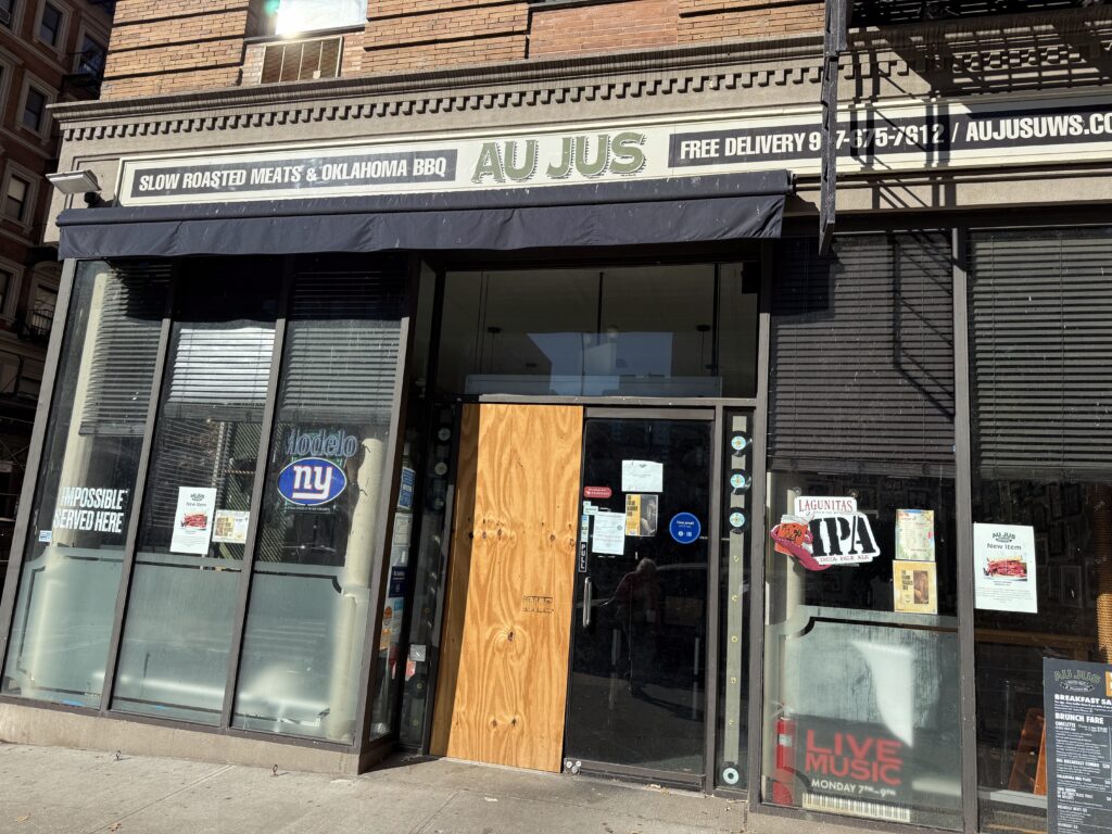 Au Jus, a barbecue restaurant at 2621 Broadway (at West 96th Street), appears to be closed. The company did not respond to West Side Rag’s outreach, but there is a marshal’s sign posted in the window, dated October 7th, 2025, saying the landlord has legal possession of the premises. The Au Jus website says their East Harlem location is temporarily closed for repairs, and the Upper West Side location is no longer listed. (Thanks to Jay for the tip.)