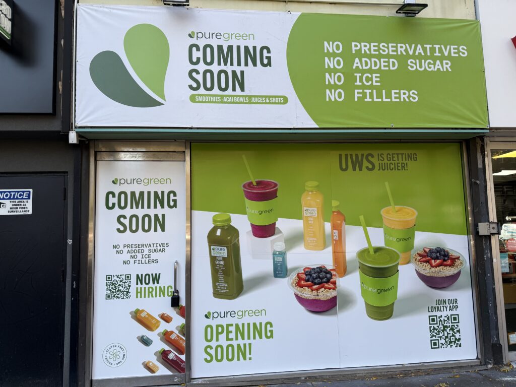 Pure Green, a juice shop, is coming to 2041 Broadway between West 70th and West 71st streets), in January 2026. It will serve smoothies, cold-pressed juices, and acai bowls. The chain has numerous locations nationwide; this will be the eighth location in New York City. Micheal Trenk, the owner of Prohibition, the bar and lounge at 503 Columbus Avenue (between West 84th and West 85th streets), is behind the upcoming Broadway Pure Green franchise. Trenk used to live near the commercial strip where the shop will open, and had “envisioned launching in that space for years,” he told West Side Rag in a phone interview. He met his business partner, Michael Cecchini, during frequent visits to the Pure Green Harry’s Table location. When Harry’s Table closed earlier this fall, Trenk and Cecchini secured the new space together. “Having lived on the Upper West Side for years, I am committed to re-energizing the neighborhood retail landscape and investing in new openings and collaborations that keep business and community activity rooted in the UWS,” he told the Rag. Pinkberry, the frozen yogurt shop which closed in September, was previously in the space.