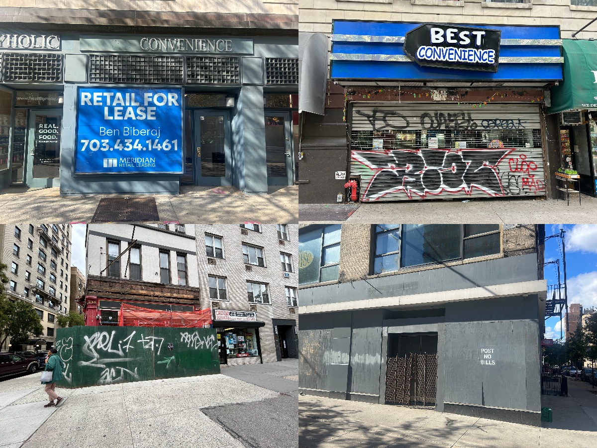 A number of these are upcoming tear downs for example one of the snaps is of the old version store at 79&Bway. Once the gyms lease is up the building is coming down. A number of others are illegal pot shops that were selling much more than pot. Best Buds connivence and the store at 104. Those are in varying legal situations that will add additional hurdles to getting them rented again