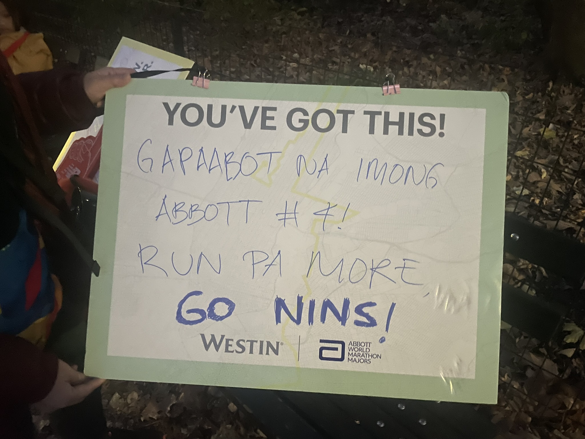 Near that same West 86th Street spot, Upper West Sider Ella Lim was wrangling two nieces, a large cardstock sign, a foam finger, and a megaphone (there had been a balloon, too, but that got ditched along the way). It was the end of a long day of marathon spectating, and Lim had come to support her sister, who had flown in from the Philippines to run the fourth of the six marathon “majors” (she already had Tokyo, London, and Berlin under her belt; now, only Boston and Chicago remain).