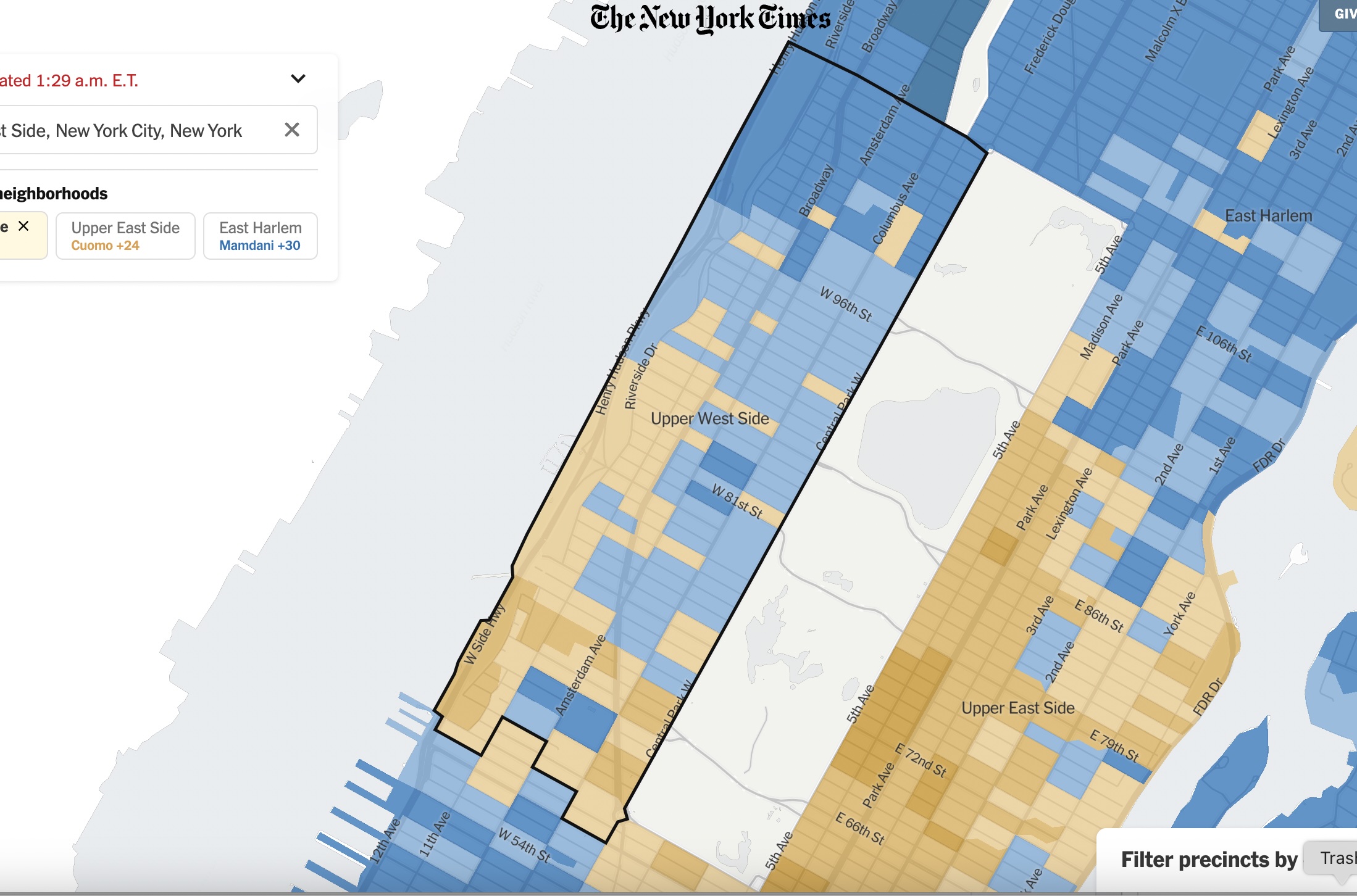 In general, Cuomo won the voting precincts in the southern portion of the neighborhood, from around West 59th to 86th Street, while Mamdani won more of the votes from West 87th to 110th streets.