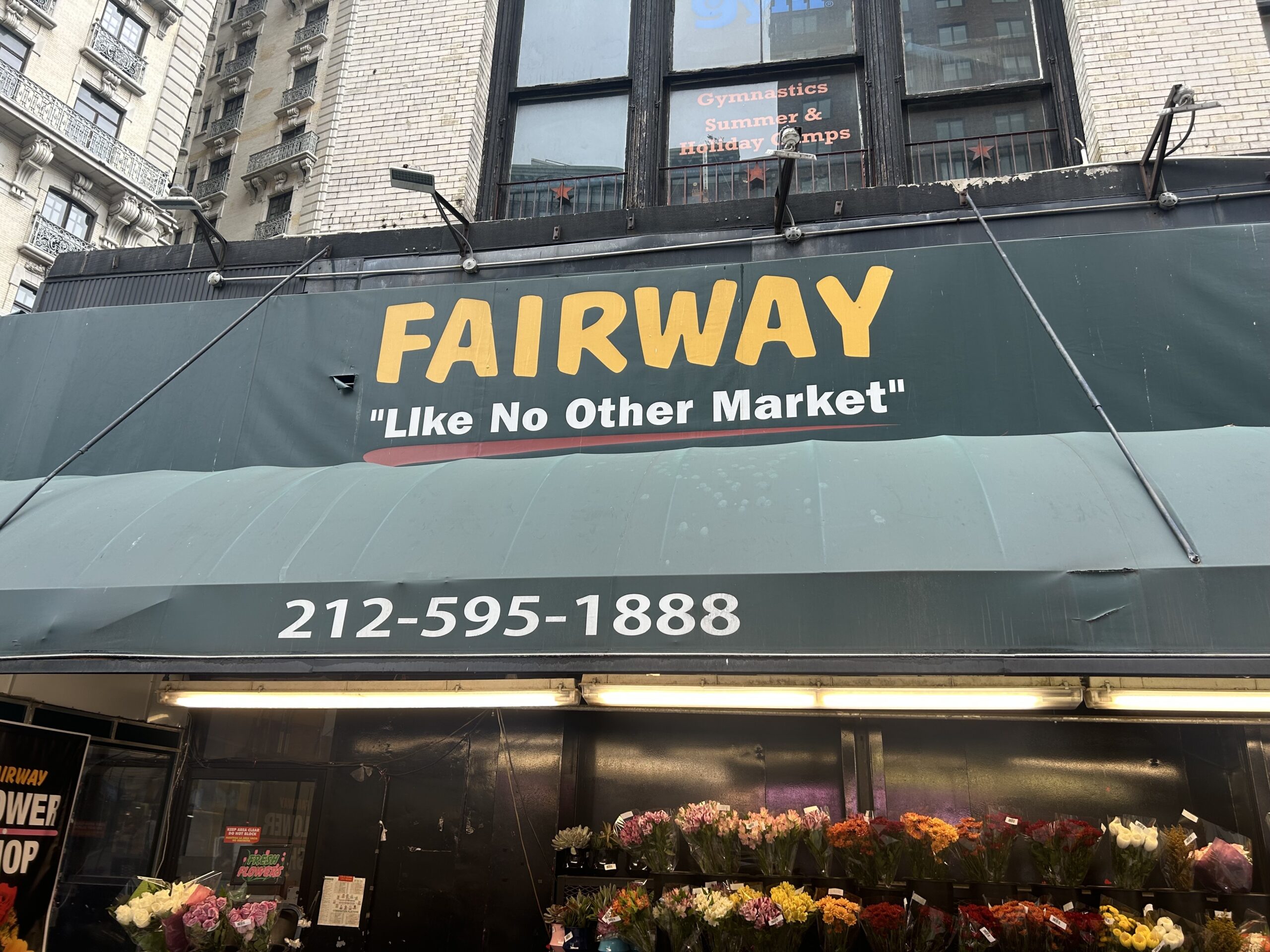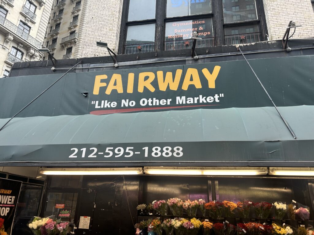 It has come to our attention (and now yours) that there is an error in its storefront signage. Fairway’s slogan is “Like No Other Market,” and the line appears on the store’s Broadway-facing signage six separate times. The signage is the same format in each case, “Fairway” in yellow capitalized letters, and then, “Like No Other Market” in smaller, upper and lowercase white letters underneath.