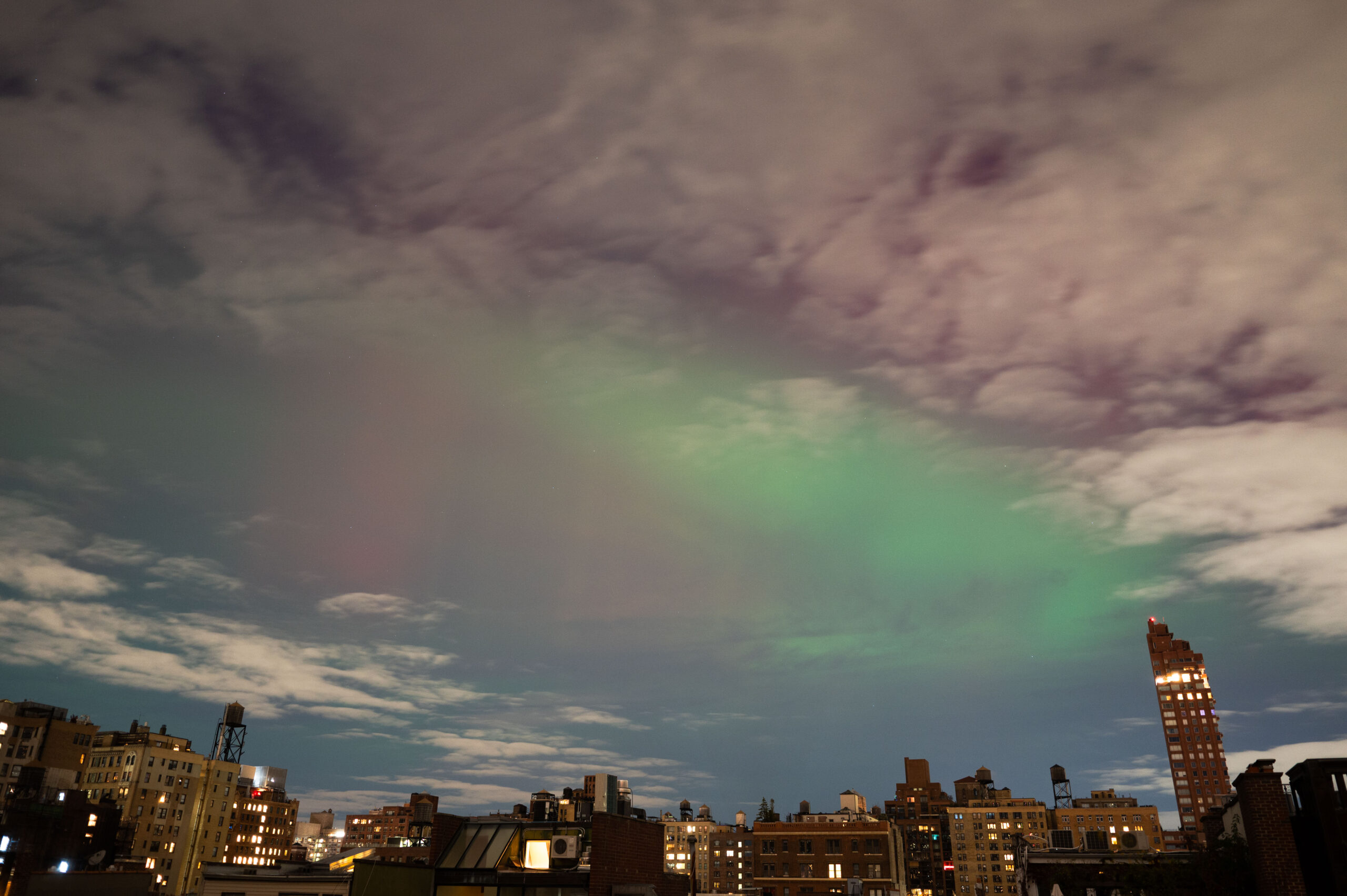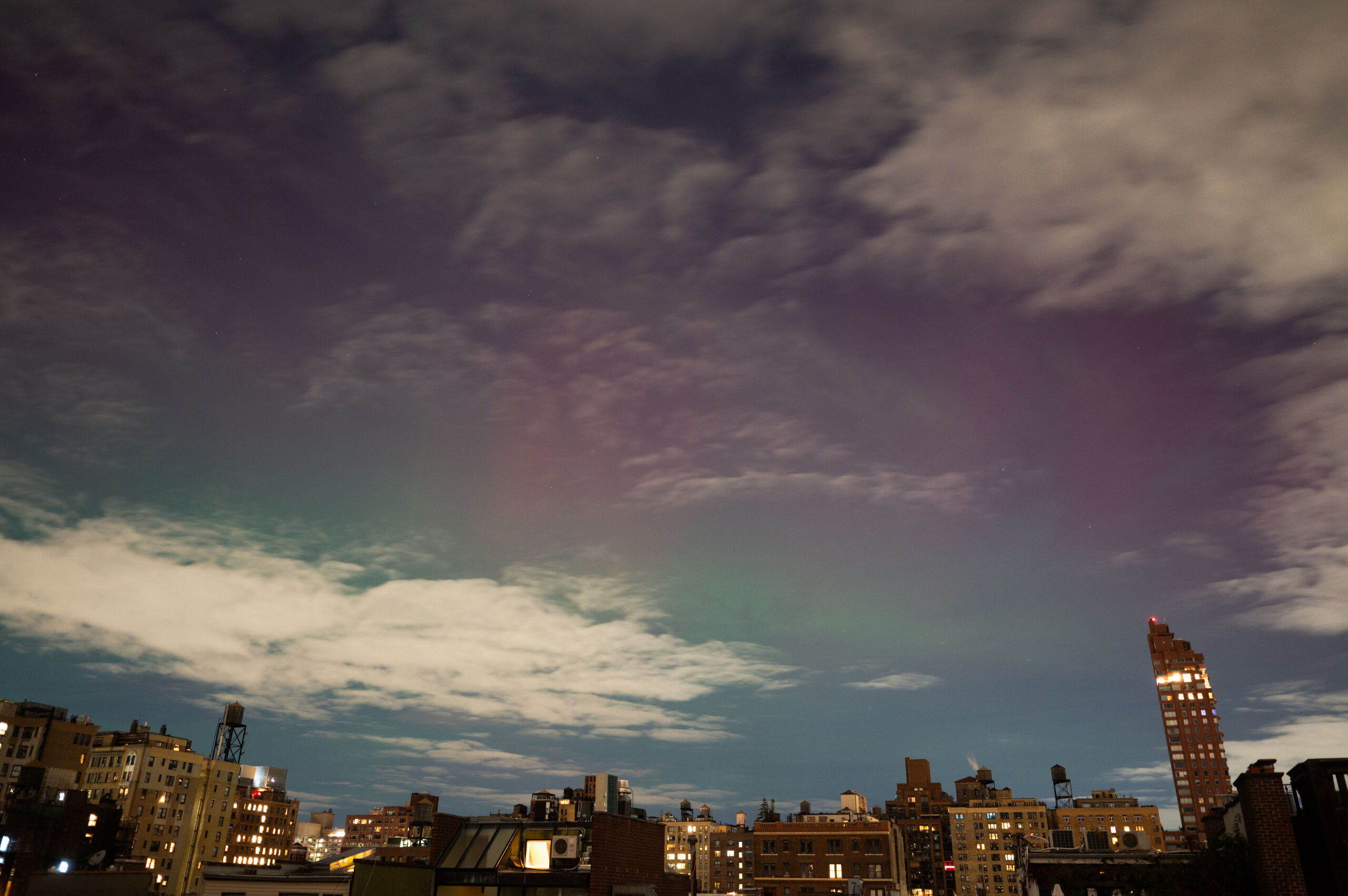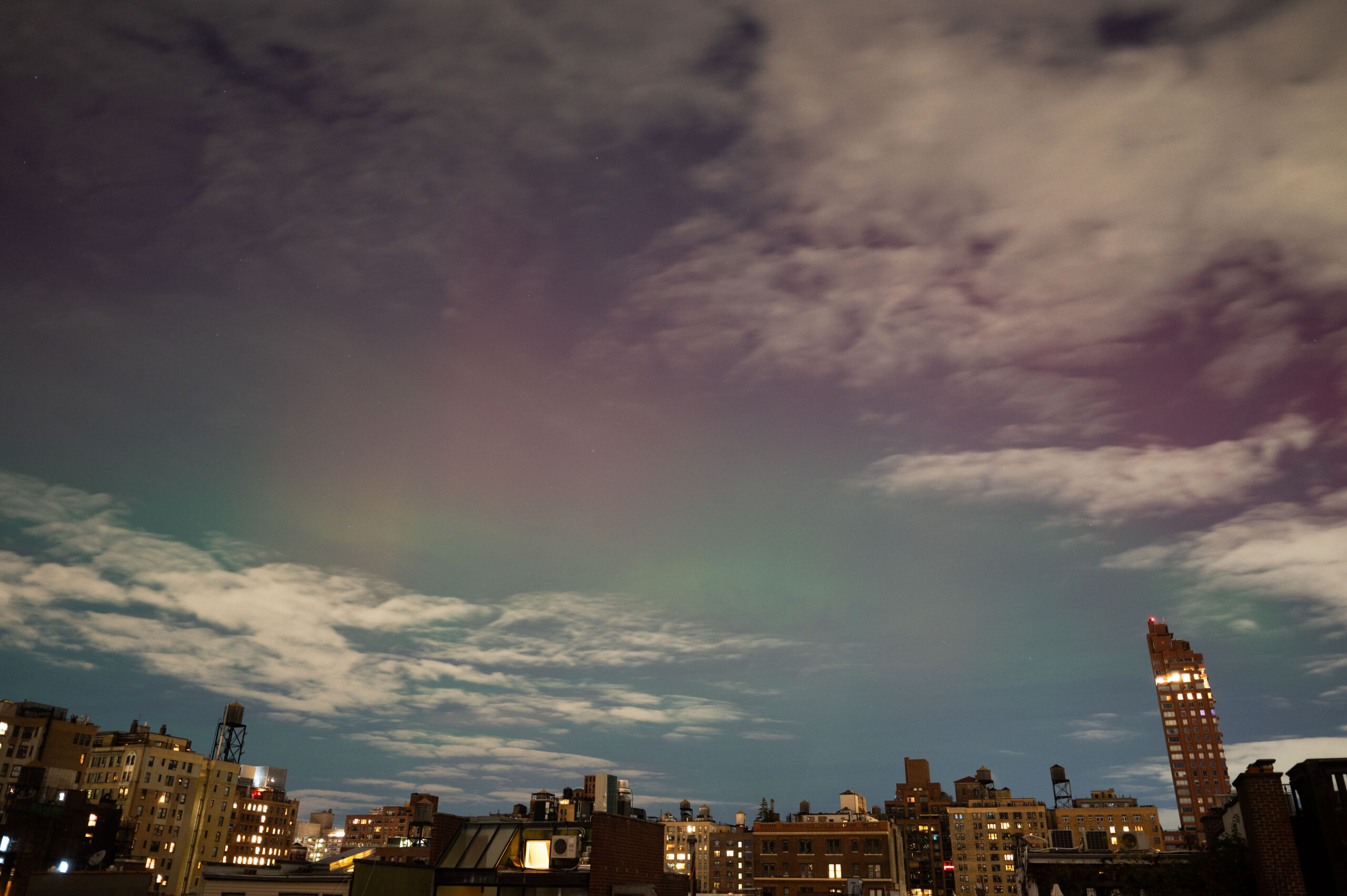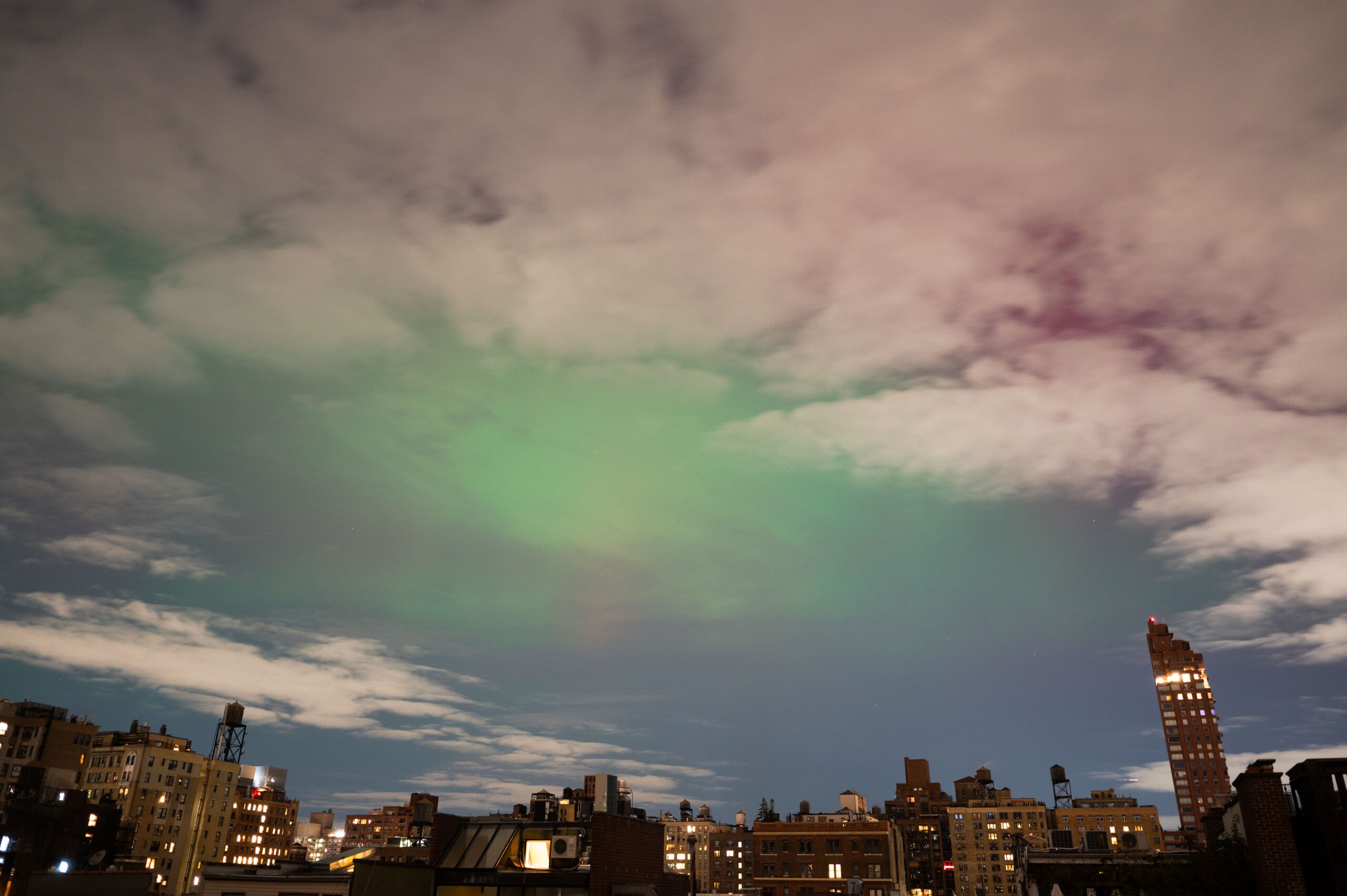 “When I heard about the impending auroras last night, I set up my camera on my roof on West 74th St and put it on a timer overnight,” Hobbs wrote in an email. “I was able to capture some colors through a break in the clouds at about 11:30pm. The light show was brief – only about 10 minutes!”