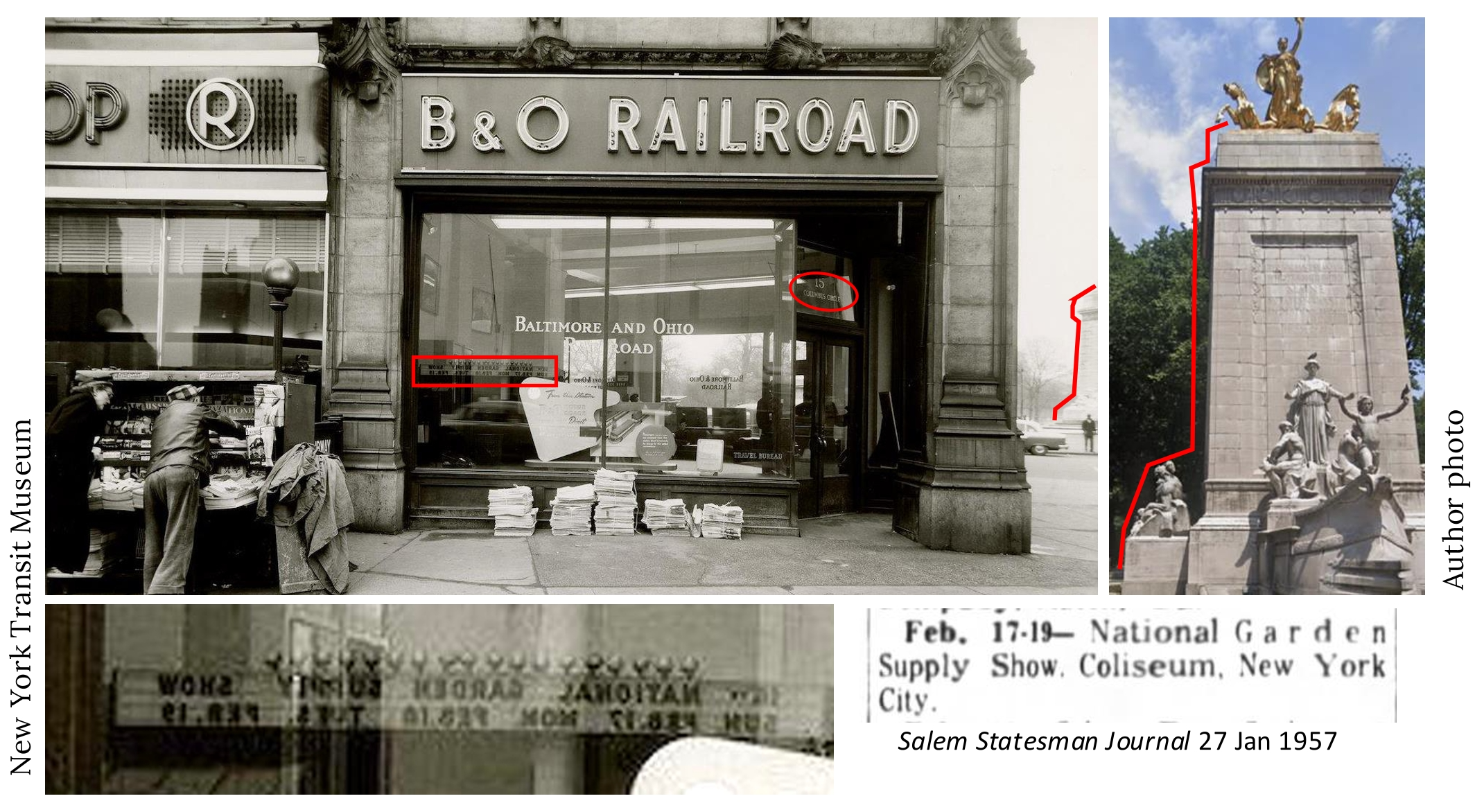 The internet will tell you that the National Garden Supply Show was held at The Coliseum in New York February 17th to 19th, 1957. The Coliseum was the ugly convention center that New Yorkers loved to hate. It occupied the property where the Deutsche Bank Center (formerly the Time Warner Center) now stands, directly across from the B&O office at 15 Columbus Circle. That 15 Columbus Circle address, by the way, was legible over the door of the B&O office—but that would have been too obvious a clue, so I blurred it.