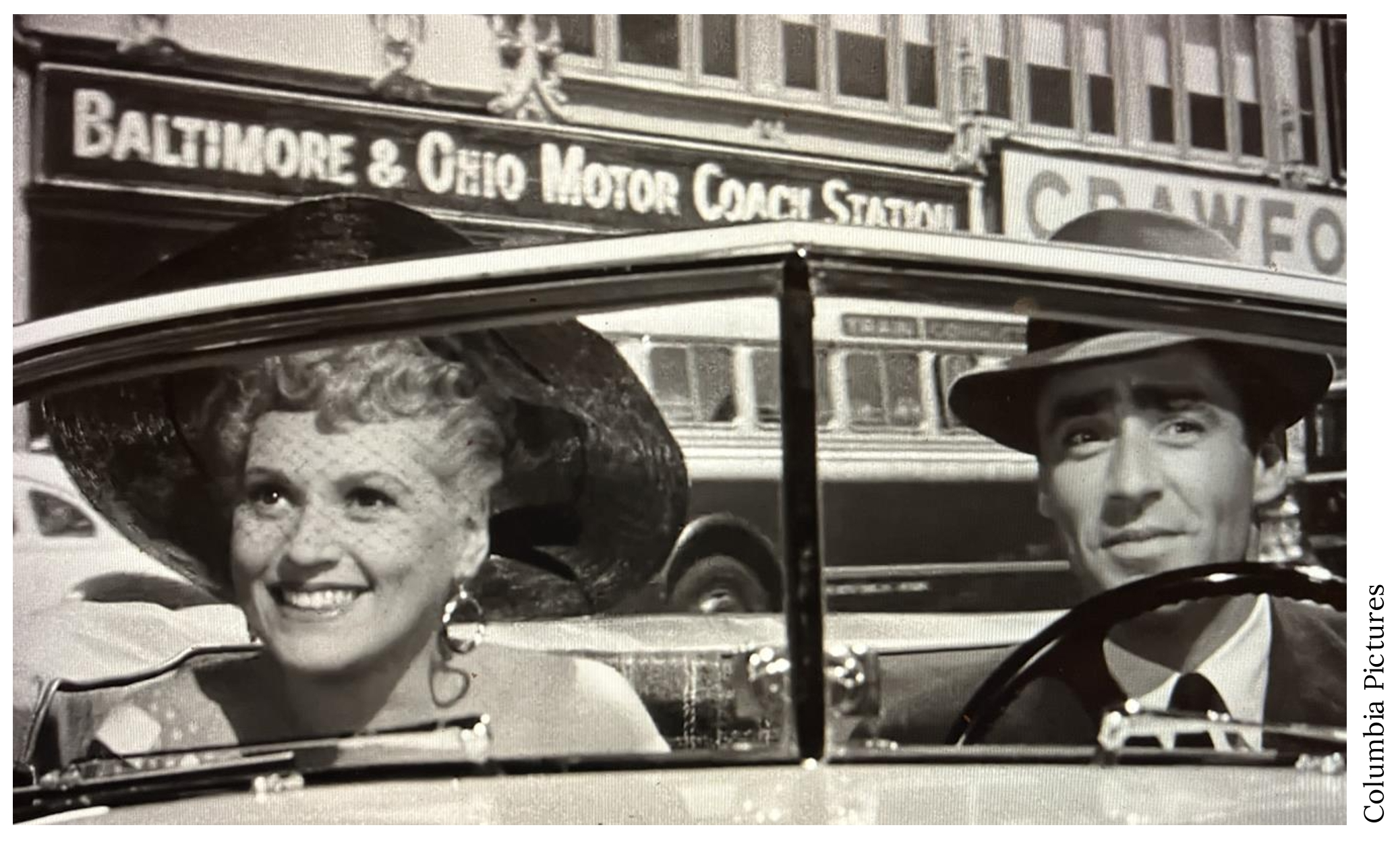 Now, why would there be a railroad office at Columbus Circle? To sell tickets, yes, but the story was much more interesting than that. There’s a two-second glimpse of the side of the B&O office at 27:29 of the 1954 movie “It Should Happen to You.” Note two things in this still from the movie: The building sign reads “Motor Coach Station” and the bus visible behind Peter Lawford has a label reading “Train Connection.”