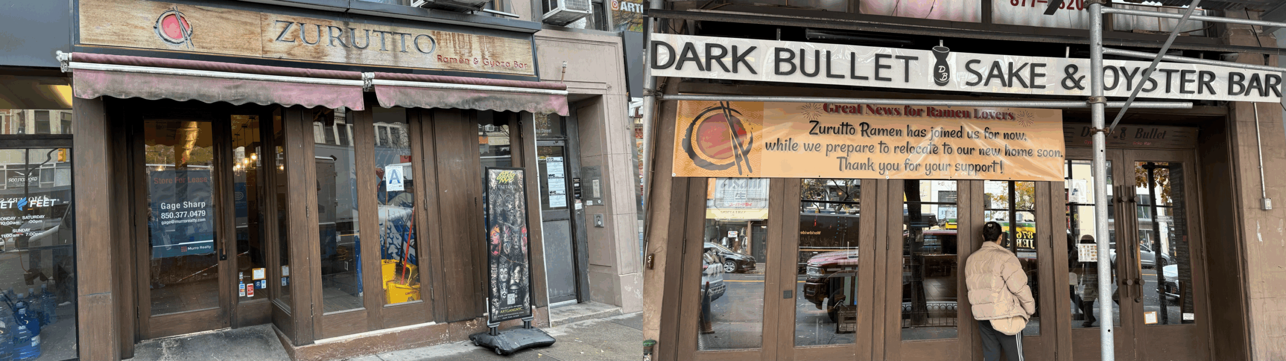 Zurutto, the Japanese ramen restaurant at 142 West 72nd Street (between Columbus and Amsterdam), which closed in August due to high rent, began temporarily operating out of Dark Bullet Sake & Oyster Bar, at 154 West 72nd Street, on November 8th. Zurutto, Dark Bullet, and Tenzan, (at 285 Columbus Avenue), are all under the same ownership. The owners are searching for a permanent new home for Zurutto in the neighborhood, a representative told West Side Rag on a phone call. Until then, it will operate out of Dark Bullet with an abbreviated menu. The restaurant will continue to serve ramen dishes but will have fewer appetizer options, the representative said.
