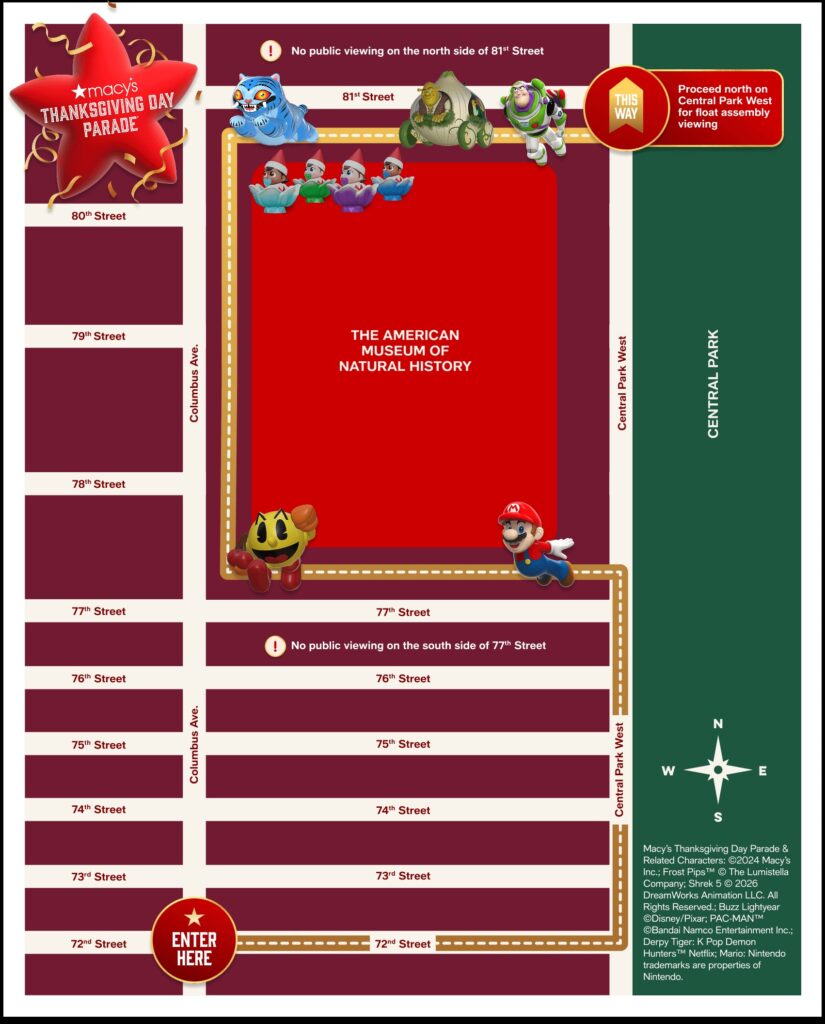 After viewing the balloons, guests will exit the inflation area at West 81st Street and Central Park West, and head north on Central Park West to see the float assembly between West 81st and 86th streets.
