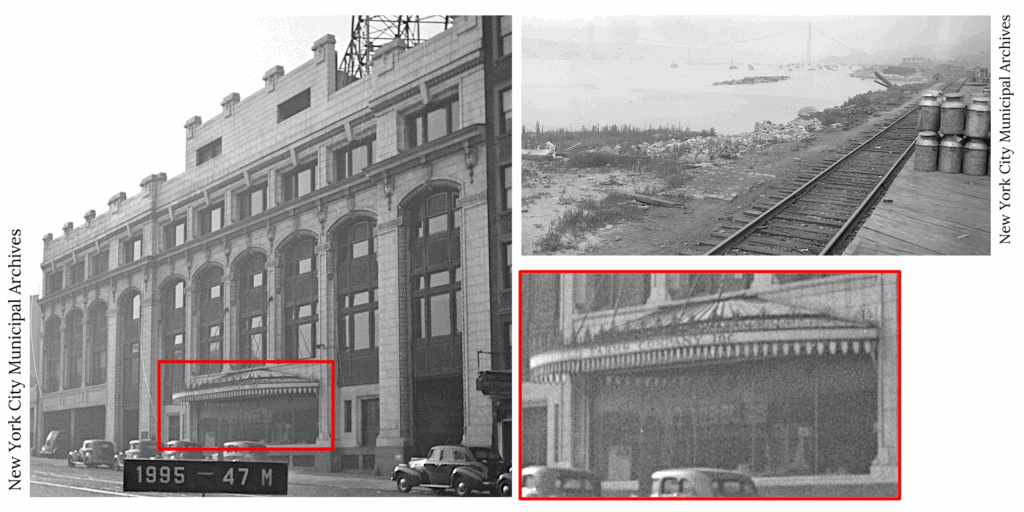 Clues: The large light-colored building in the center-left of our mystery photo still stands, but there were other clues. In the background, the open trusswork of the elevated subway station at 125th Street looks nearly identical today to its appearance a century ago. The triangle in the upper left corner isn’t an artifact of the photograph—it indicates that the photographer was standing under the viaduct that takes Riverside Drive over the Manhattanville valley, and caught a bit of the supporting arch—it’s a scene you can duplicate today. Finally, the prominent Sheffield Farms Sealect sign was a hint that we’re in Manhattanville, which once processed 60% of New York City’s milk supply.