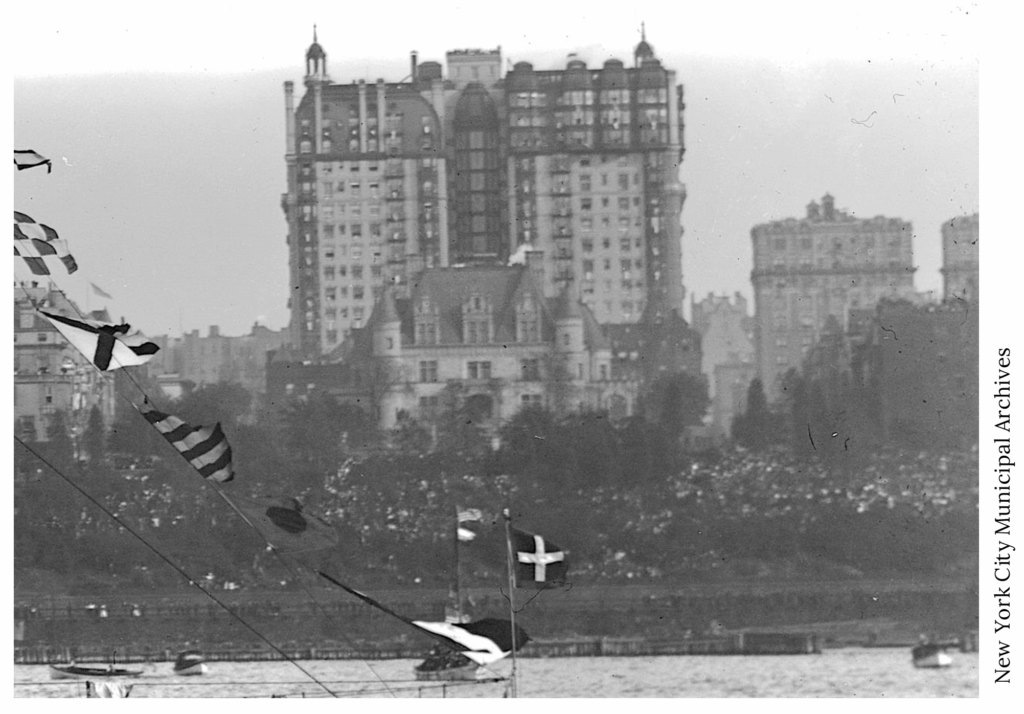 I believe the photo shows the back of the Antonia apartment building, the Schwab Mansion from the Hudson River, looking east. Possible from a boat with bunting strung on it. In early 1900s