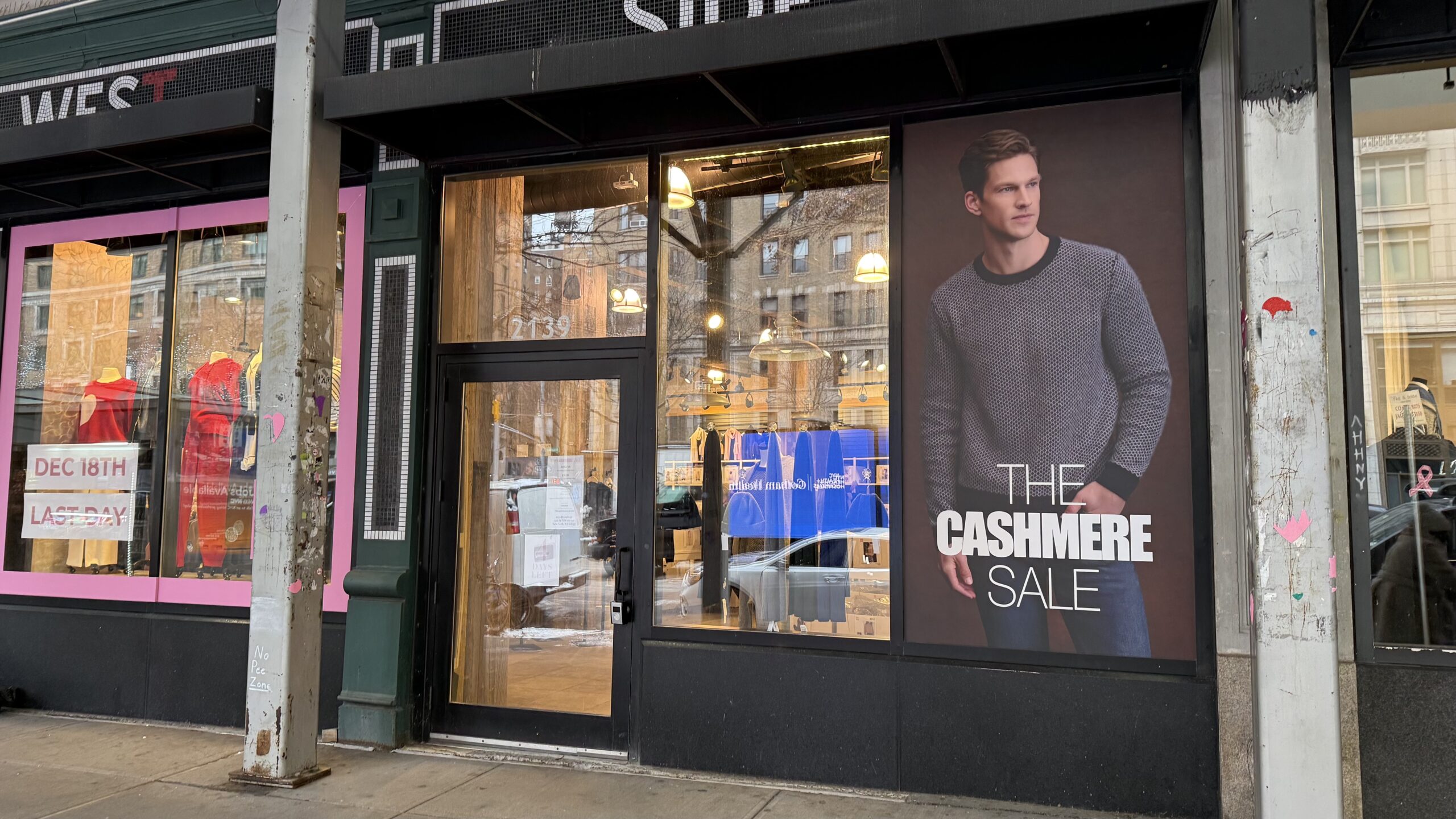 The Cashmere Sale, the annual pop-up, is closing on December 18th. It opened for the season in October at 2139 Broadway (at West 75th Street). The Cashmere Sale sells cashmere sweaters, jackets, vests, hats, gloves, and scarves at discount prices. The company operates pop-ups October through December at multiple locations throughout NYC and nationwide.