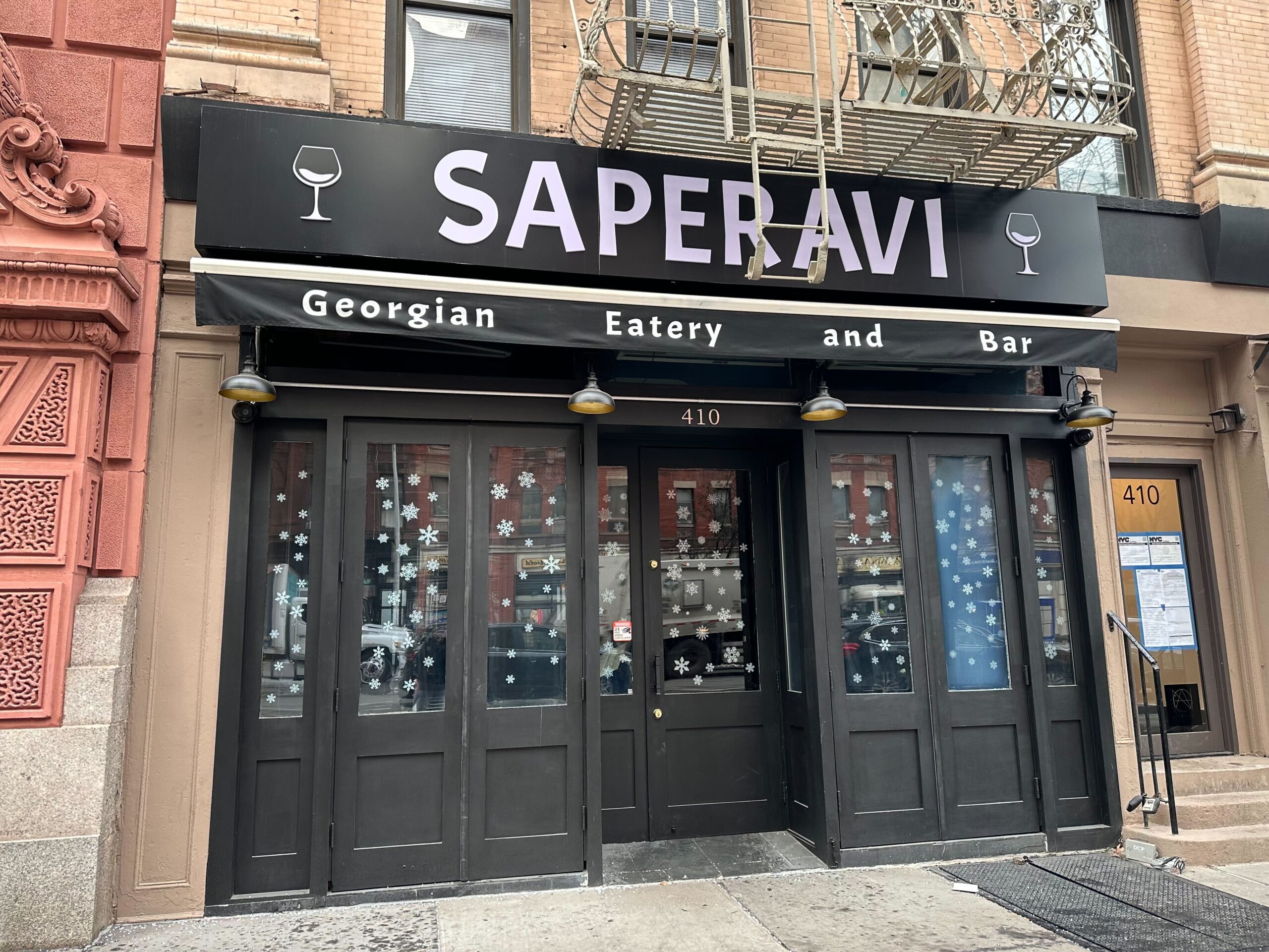 Saperavi, a Georgian restaurant and wine bar, opened at 410 Amsterdam Avenue (between West 79th and West 80th streets), on December 14th. Open for lunch and dinner, it serves authentic Georgian specialty dishes including lobio (bean stew), kupati (sausage), khinkali (dumplings), and various cheesebreads and skewers. Appetizers include; Georgian smashed avocado, motherland cornbread, eggplant rolls, and an assortment of house pickled vegetables. The menu has an “Americano” section which features an impossible burger, salmon with vegetables, and a chicken avocado wrap. “Saperavi” is a type of grape native to Georgian wine making regions. This is the third location in Manhattan for Saperavi; others are in the East Village and on the Upper East Side. Sushi Nonaka and Boka, which closed in April, were previously in the space. (Thanks to Ben for the tip.)