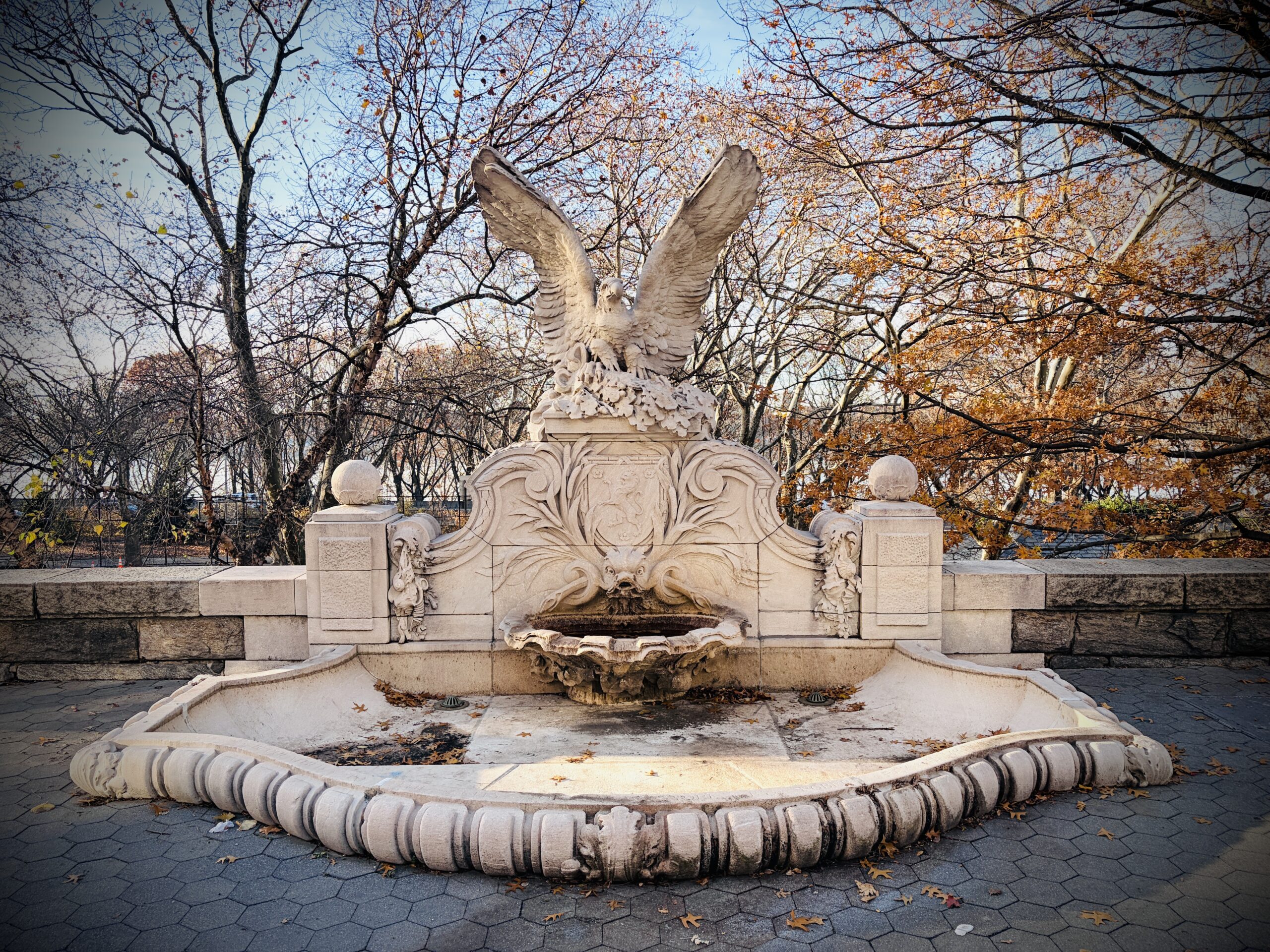 There’s still one more curious layer to the story. The fountain, embedded in a wall along the sidewalk, is widely thought to have been a horse trough. But historian Tom Miller points out that on the other side of that wall, down in the lower part of Riverside Park, there used to be a small marble bowl. Could that have been the part meant for the horses? Did they never drink from this stunning fountain after all?