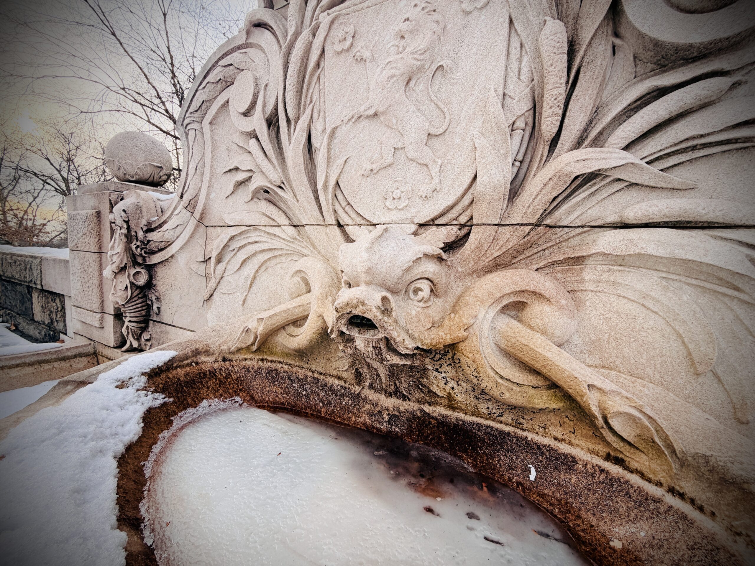 It was full of fascinating details, but one baffling claim derailed me. It said that the “lavishly carved fountain” is surmounted by an eagle with wings spread – true – a coat of arms – yep – and a dolphin’s head spray feature – what now? A dolphin? I looked back at the fountain. I would have noticed a dolphin, I’m a fan. But all I could see was what looked like a curious carp, at best. There’s an agitation to its expression that just isn’t giving dolphin vibes. At all. I consider myself a friend and admirer of marine mammals. In fact, I adopted a whale when I was a teenager, certificate and all, so I think I know what I’m talking about.