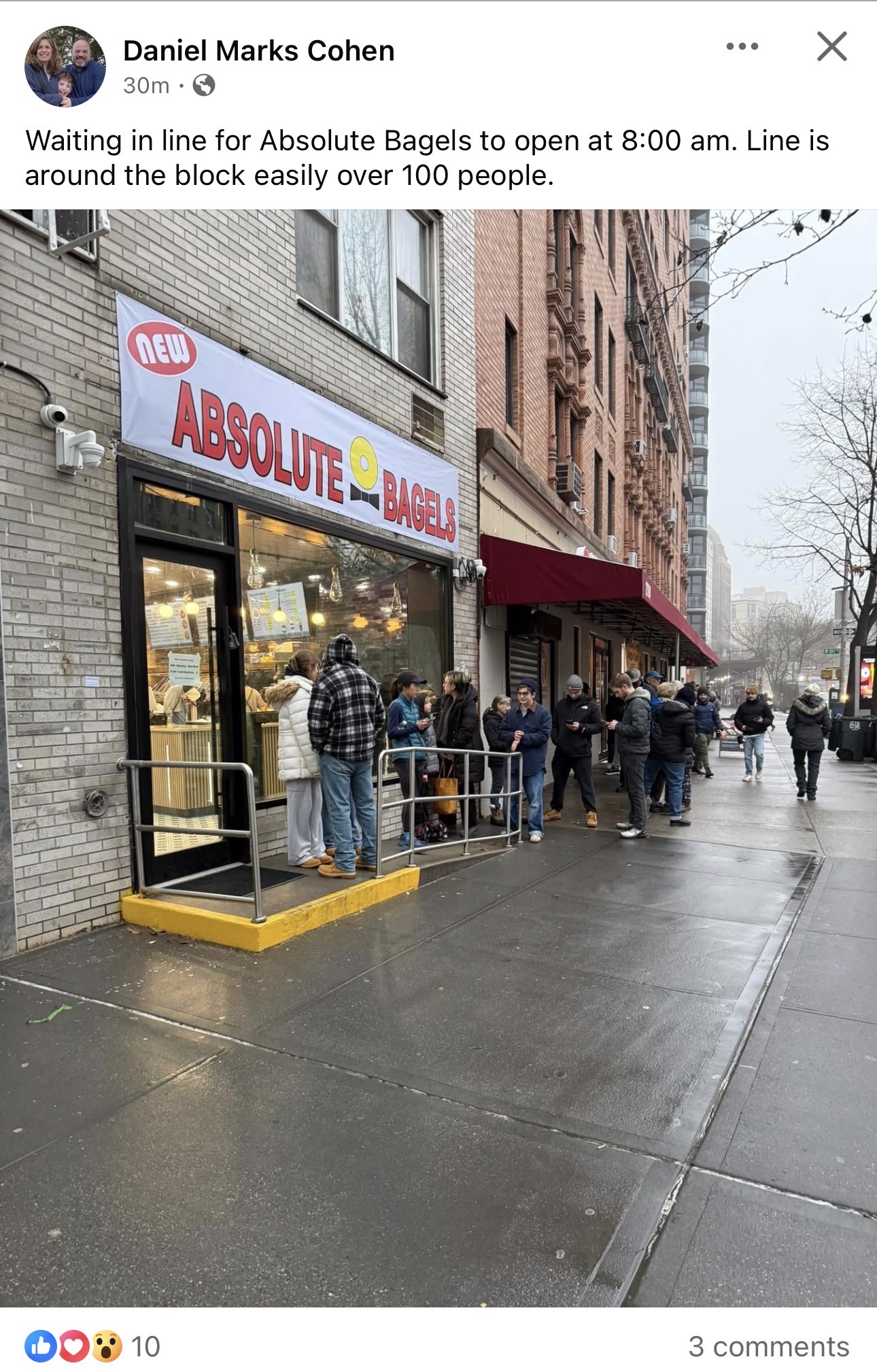 One early riser, Richard Robbins, told the Rag over email that he’d arrived at 6 Monday morning, hoping that New Absolute Bagels would be open, but that no one was there yet.