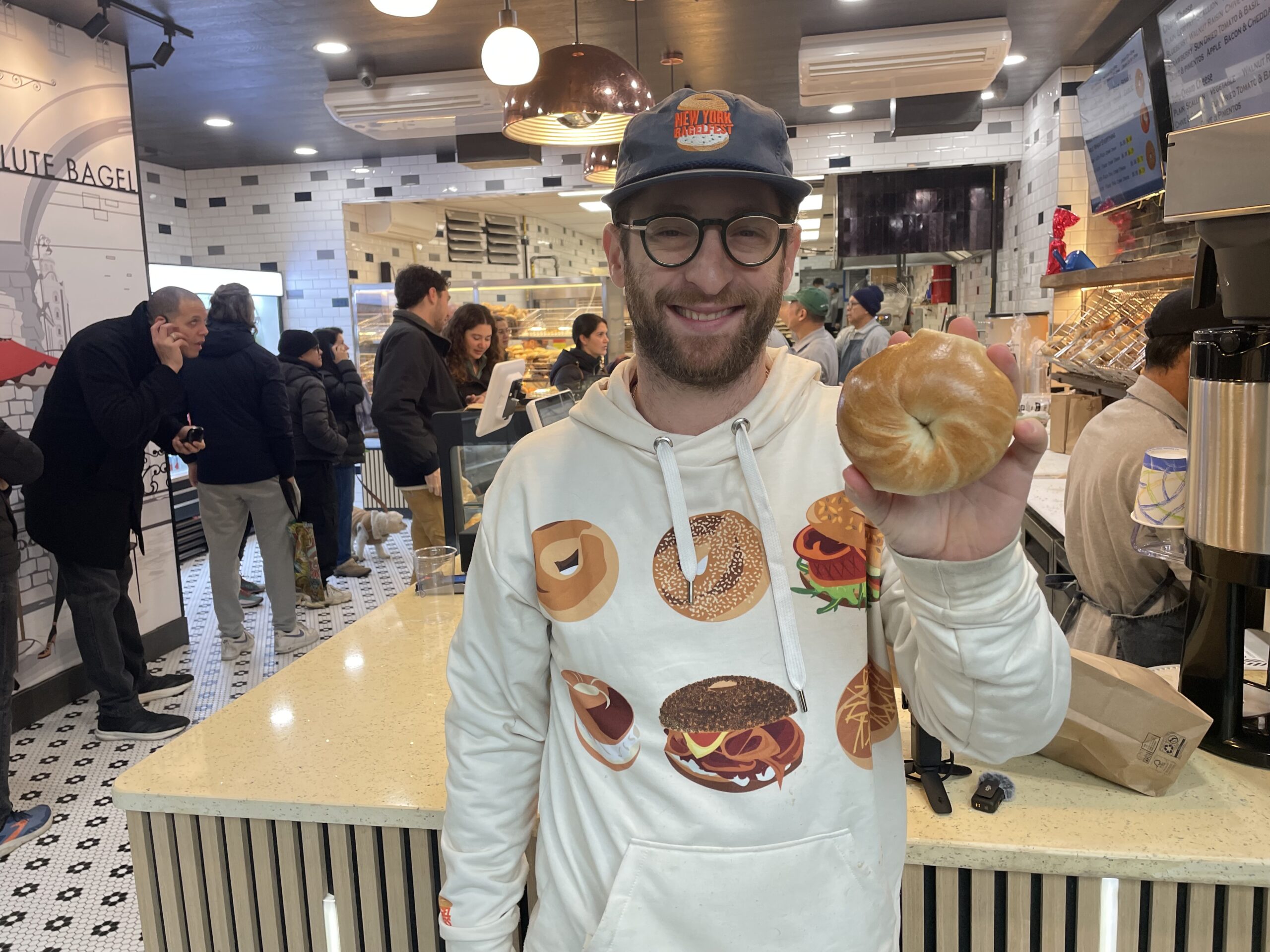 One shop visitor in full bagel regalia was Sam Silverman, the “Bagel Ambassador” for New York, whose company, BagelUp, produces New York’s annual BagelFest.