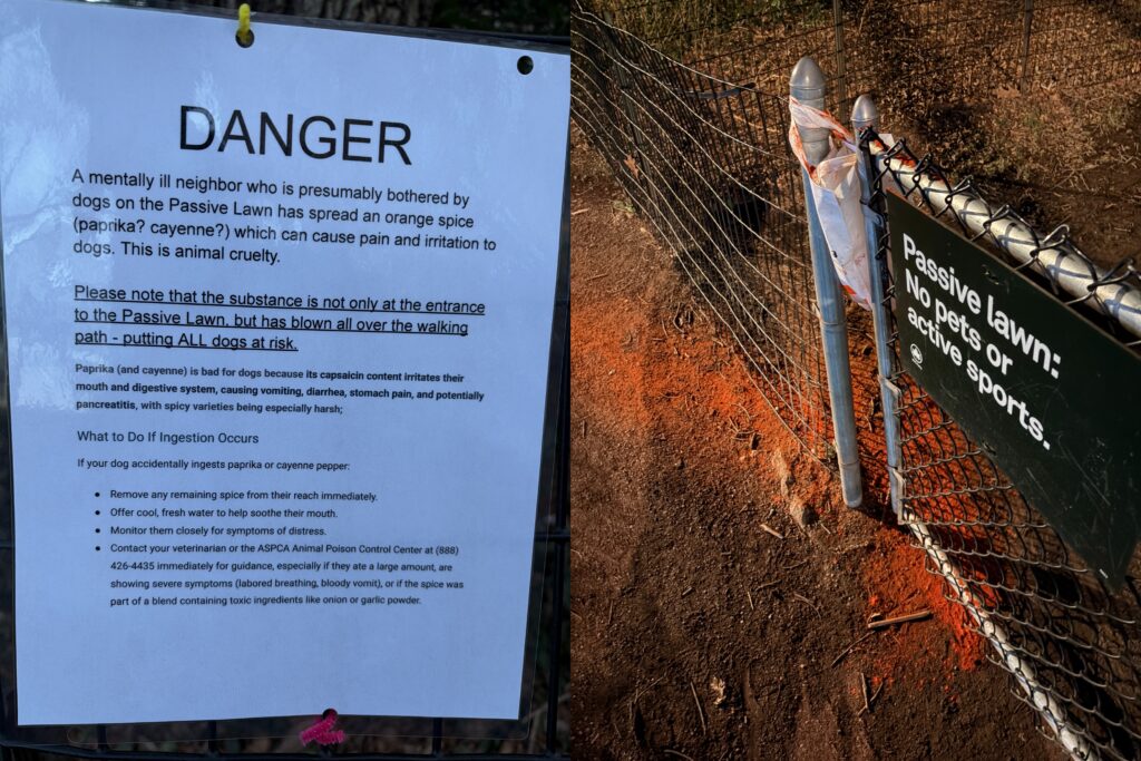 The signs allege that someone was spreading “an orange spice…which can cause pain and irritation to dogs.”