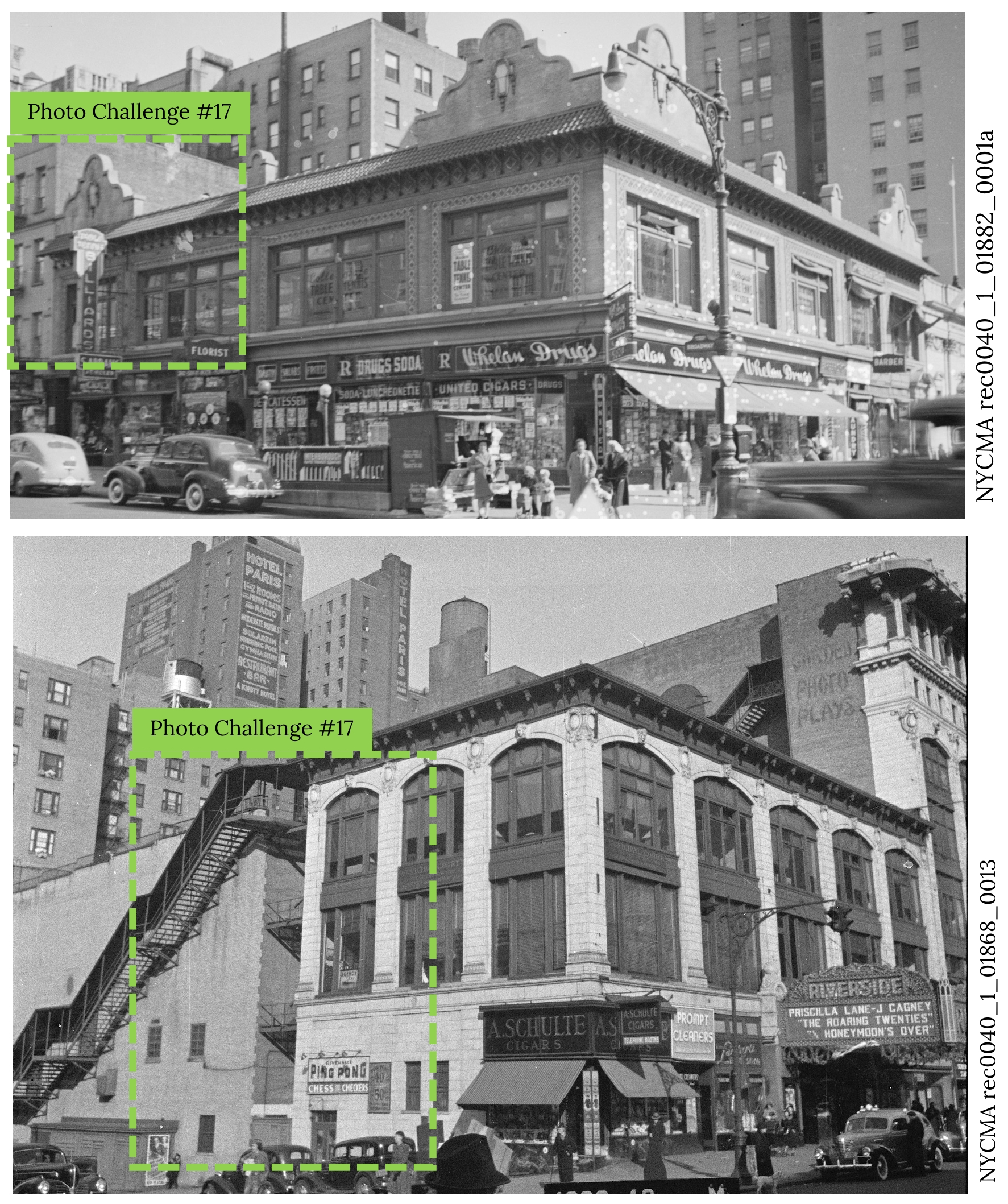 Welcome to another installment in the Rag’s Historical Photo Challenge. The images above were taken somewhere on the Upper West Side, sometime in the past. Can you figure out where, when, and what they show? Look closely; this week’s challenge photos, like the others in the series, include clues that will help you identify the scene, if you’re a dedicated UWS history sleuth. And even if you don’t recognize the pictures—not to worry! Come back in two weeks and I’ll decode them, show you the clues that help identify them, and—best of all—tell you a story the image unlocks, because this column isn’t just a test of your neighborhood knowledge; it’s also a rolling celebration of the people, buildings and events that wove the tapestry of the Upper West Side.